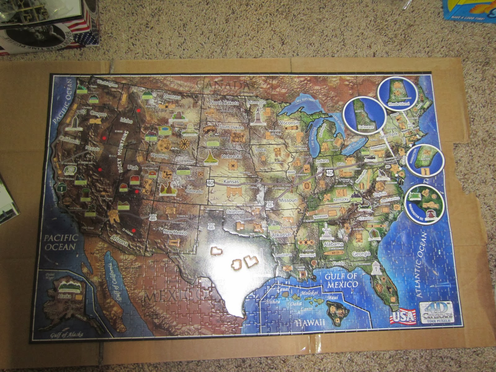 Jan. 4th, 2014 07:20 pmНа Новый Год нам подарили два трехмерных пазла: США и Нью-Йорк. Вот Новый Год я встречал, собирая historic USA - первый слой головоломки, который является традиционным картонным jigsaw puzzle из 806 кусочков.