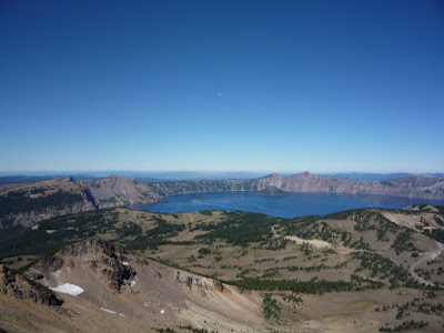 Когда мы уезжали, парковка прилично заполнилась. Разумеется, у нас была масса возможностей обозреть озеро, прилегающие и далекоотстоящие горы и Wizard Island («Остров Волшебника»).