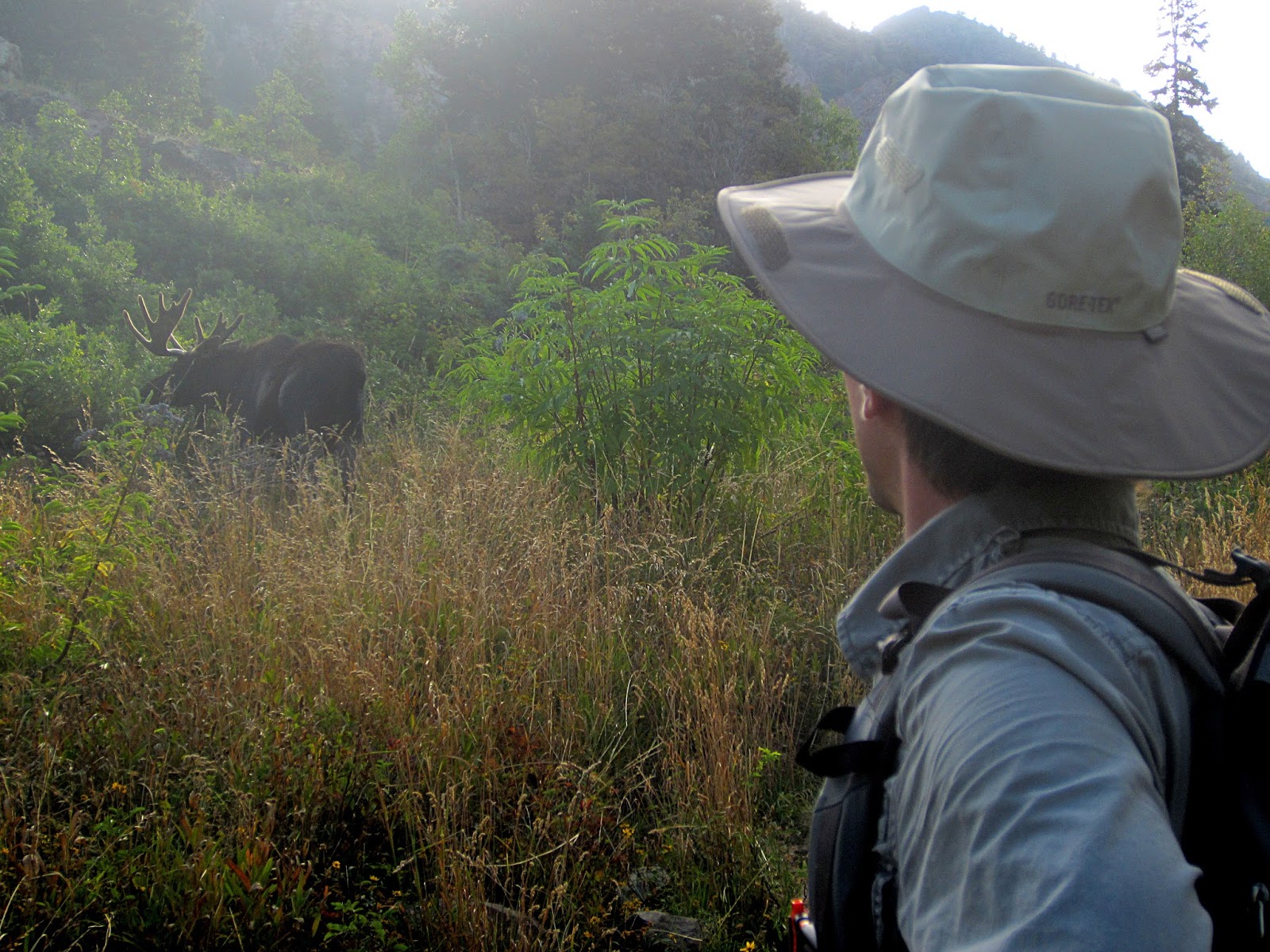 Уже в этот момент я решил, что идея пойти с утра на хайк была замечательной. Не знаю как вам, но мне увидеть лося в местных горах в тридцать раз интереснее, чем увидеть бизонов на Острове Антилоп, где они пасутся стадами и никуда не денутся. Мы уже видели здесь лося, перебегающего дорогу в утреннем тумане, но повстречать его буквально нос к носу - это совсем другое.