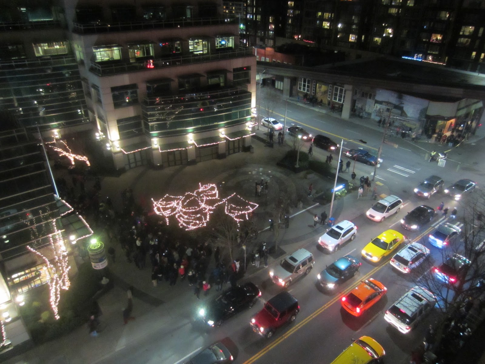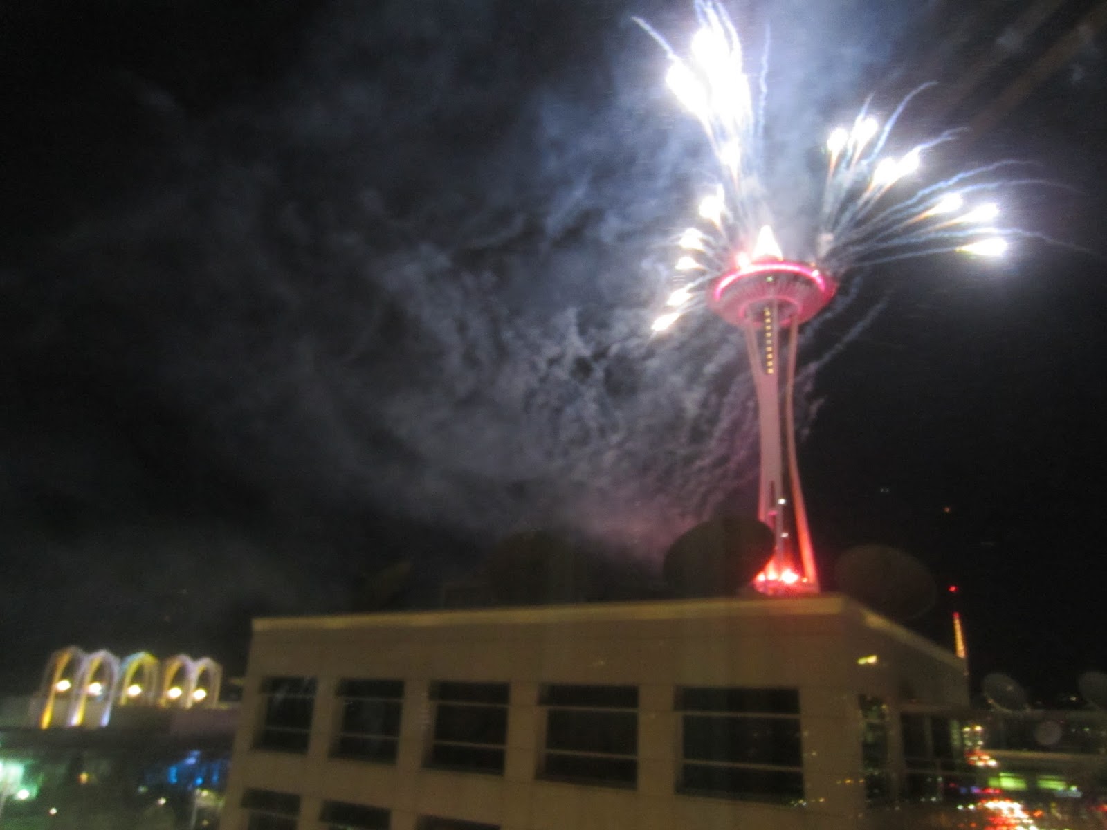 Обычно ночью на территории Seattle Center темно и малолюдно. Вроде самый центр, где с детьми должны гулять, а такое впечатление, что сейчас из темноты появятся грабители. Но в новогоднюю ночь народ там собрался. И сразу заторопился к своим машинам. По пути крича: “Seahawks! Seahawks!”, что переводится как “Зенит - чемпион!” :)