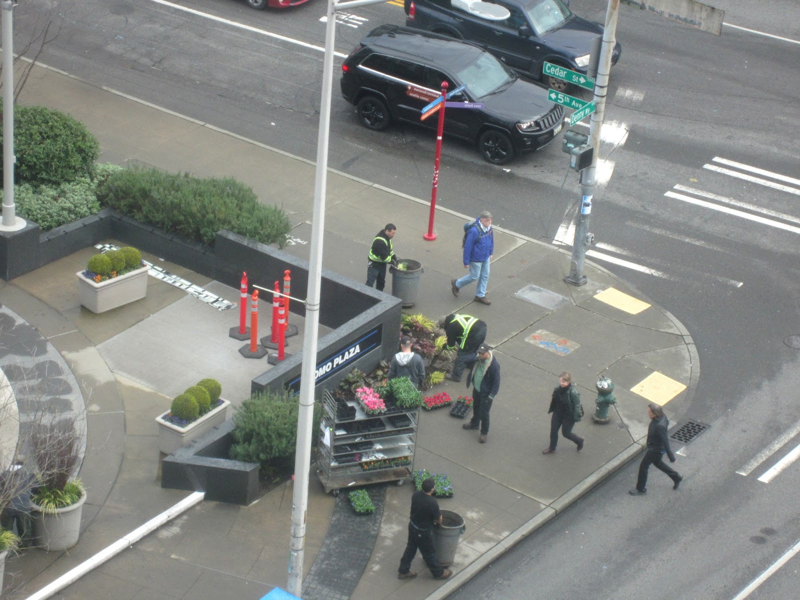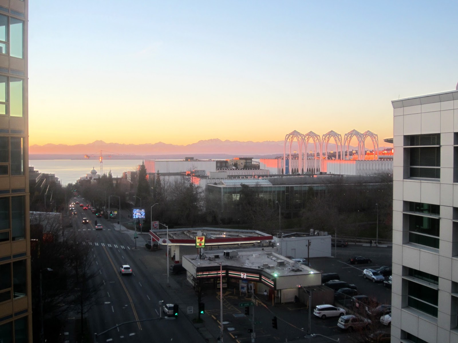 По улице едут машины (в будние дни в час пик не едут, а стоят), по небу летят с севера на посадку самолеты, по заливу Elliot Bay плавают кораблики: