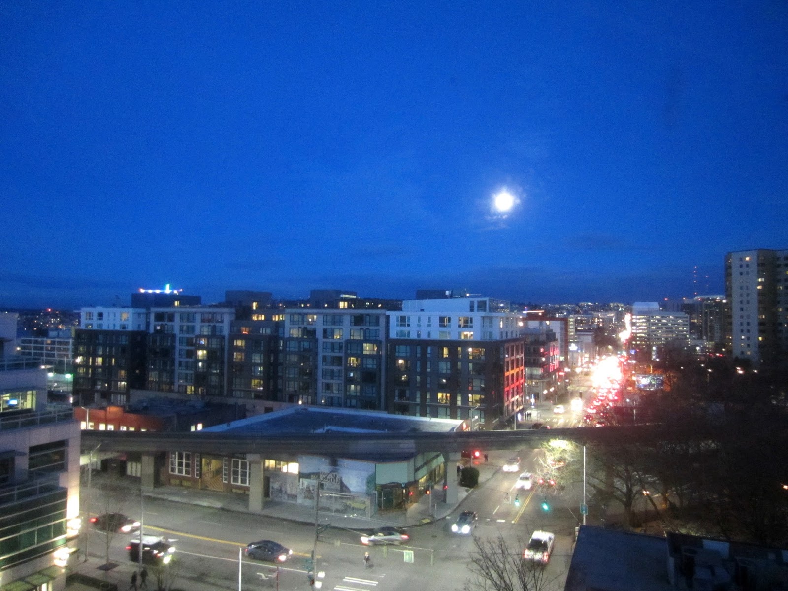 (Брат добавляет, что солнце садится только в ясные дни, в обычные сиэтлские дни его не видно). Тут я пытаюсь снять почти полную луну, взошедшую над Сиэтлом 22 января: