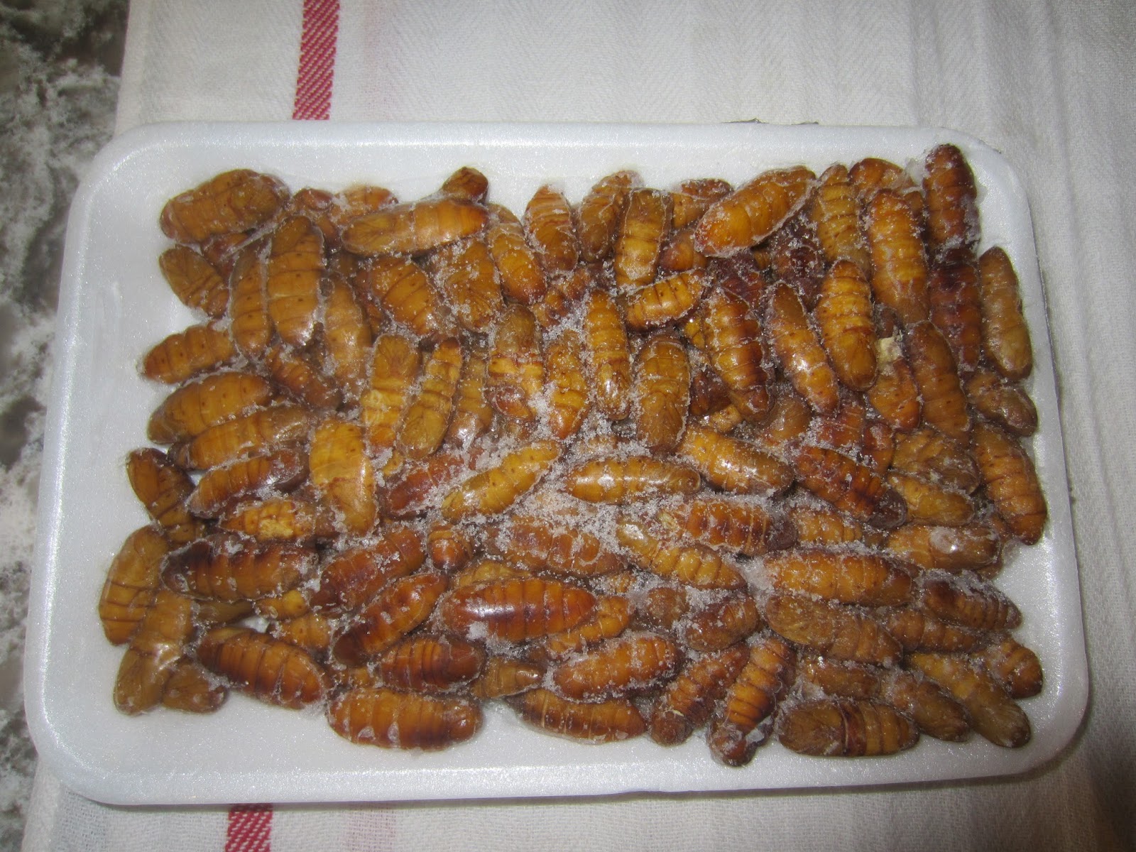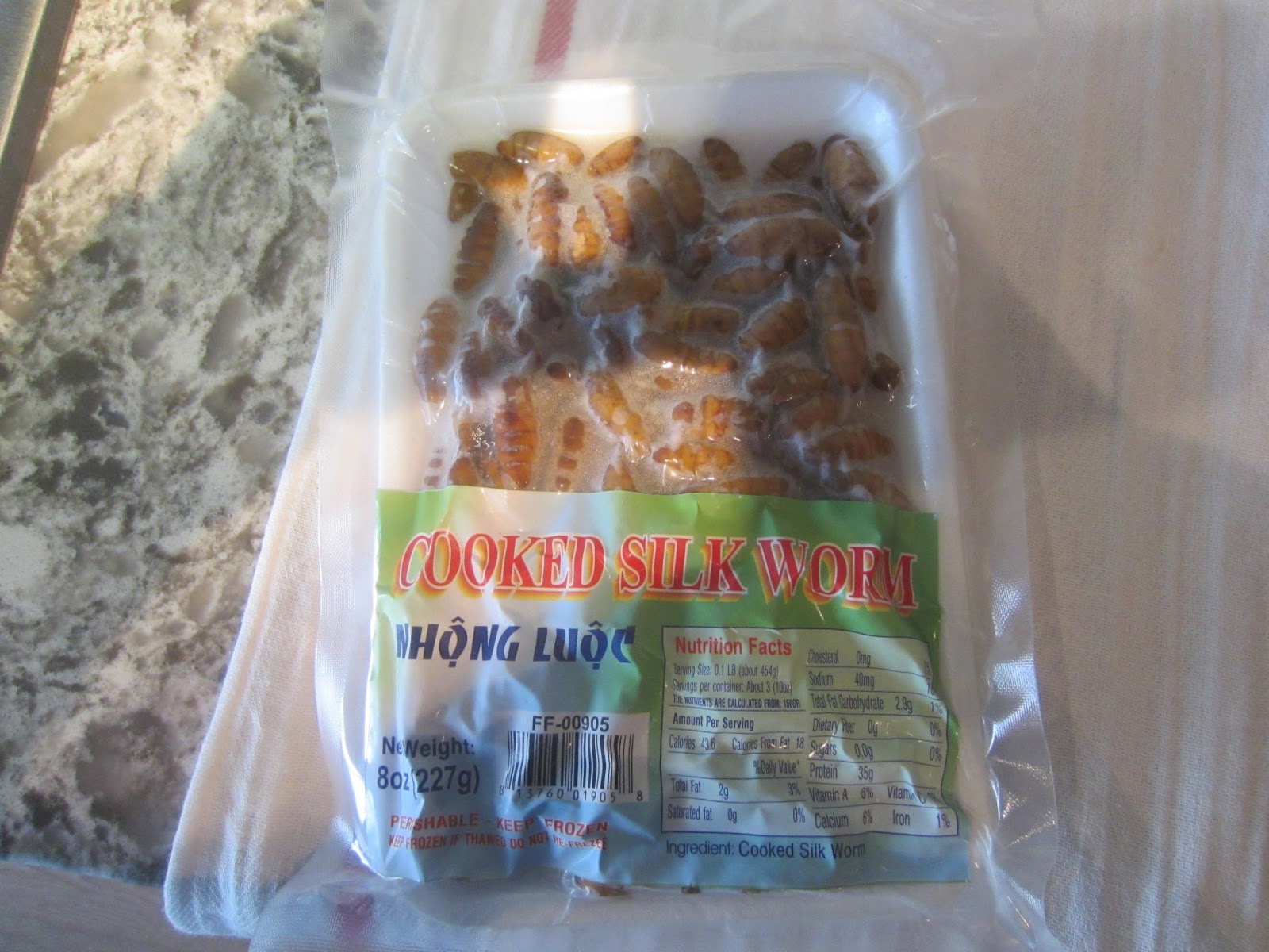 Купили мы замороженных Cooked Silk Worms. Хоть worms по-английски означают червяков, в данном случае это гусеницы шелкопряда, то есть самые что ни на есть насекомые. Как их готовить, мы не знали, но они, вроде, уже cooked - приготовленные. Разморозил, разогрел и вперед.