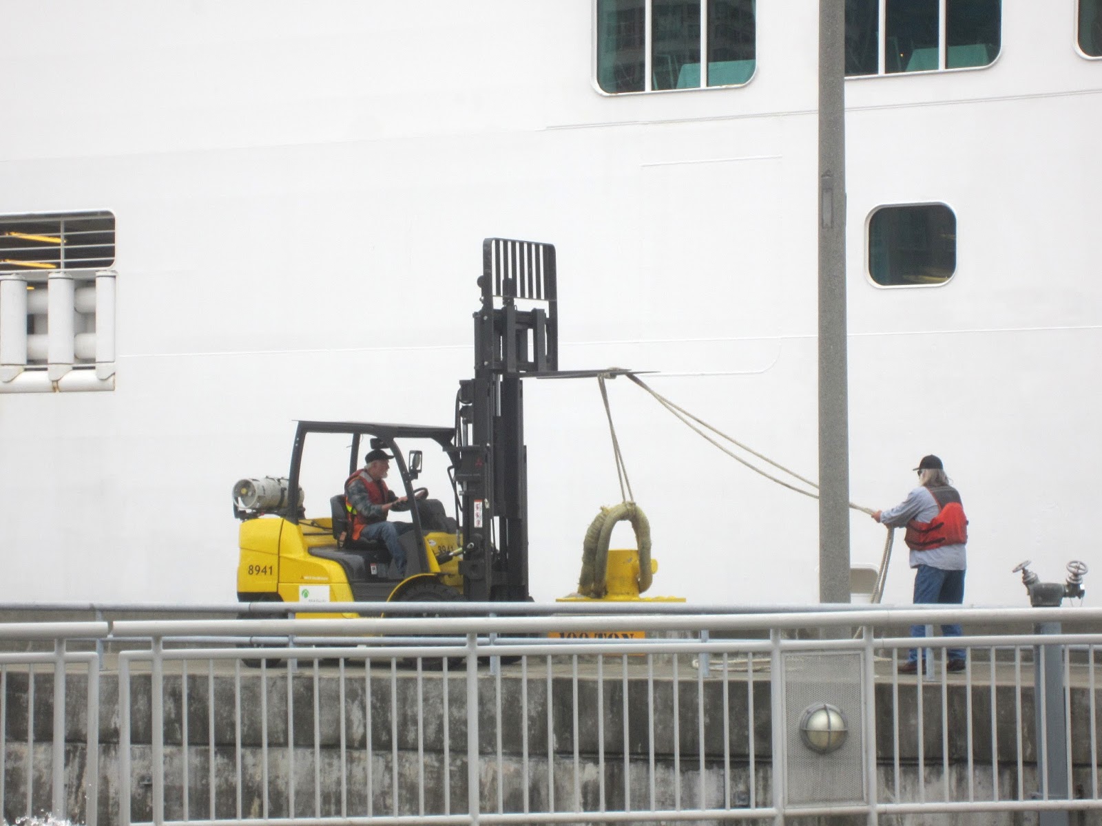 На фото аж три лайнера попались. Norwegian Pearl плывет, как я писал, от 66 пирса. Amsterdam только что отошел, а Ruby Princess на переднем плане готовится отправиться вслед за ними. Еще какая-то баржа справа стоит, но они круглый год заходят на зерновой пирс 86.