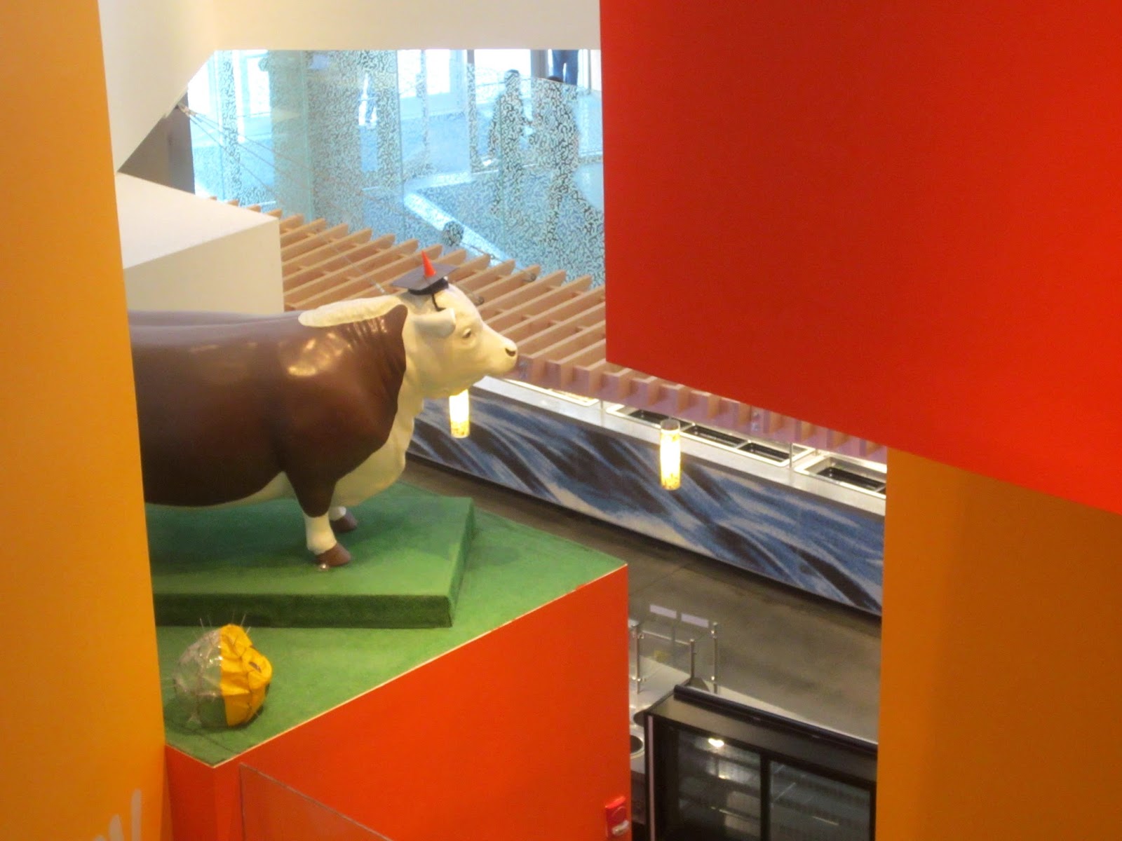 Вот и корова (на этот раз пластиковая) заняла свое место над кафетерием. Да что там корова. Полицейскую машину на крышу поднимали: