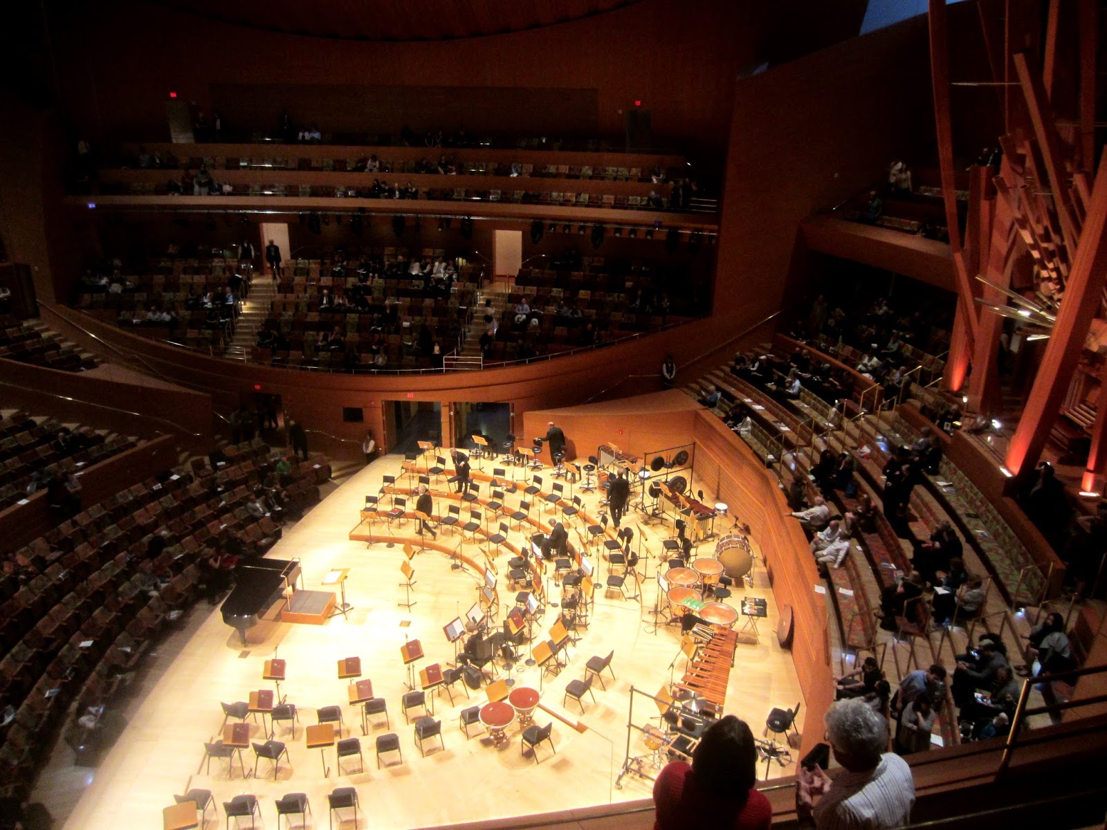 Внутренний дизайн зала не отстает от внешнего оформления холла: оркестр со всех сторон окружен зрителями, и наши места были на “террасе” позади оркестра, зато лицом к дирижеру - интересный угол обзора. Во время исполнения 24-го фортепианного концерта Моцарта 30-летняя литовская дирижер Мирга Гражините-Тила крайне эмоционально махала руками, создавая контраст со спокойным седовласым пианистом Стивеном Ковачевичем. Но самая интересная часть началась после антракта.
