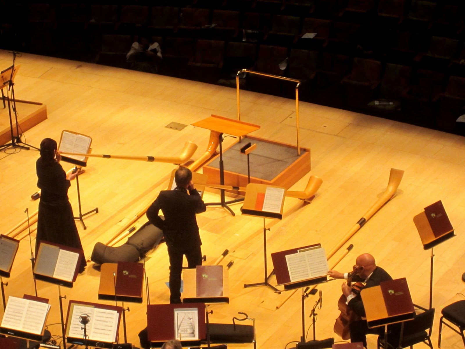 На сцене появились длинные трубы - alphorns, которые обычно в симфонической музыке не используются. Исполнялась американская премьера Концерта для квартета альпийских рогов современного австрийского композитора Георга Фридриха Хааса. Музыка необычная, но ни в коем случае не плохая. Своей громкостью и ритмичностью она напомнила мне скульптуру Fighting Dinosaurs, которую мы утром того дня видели перед музеем “натуральной истории”.