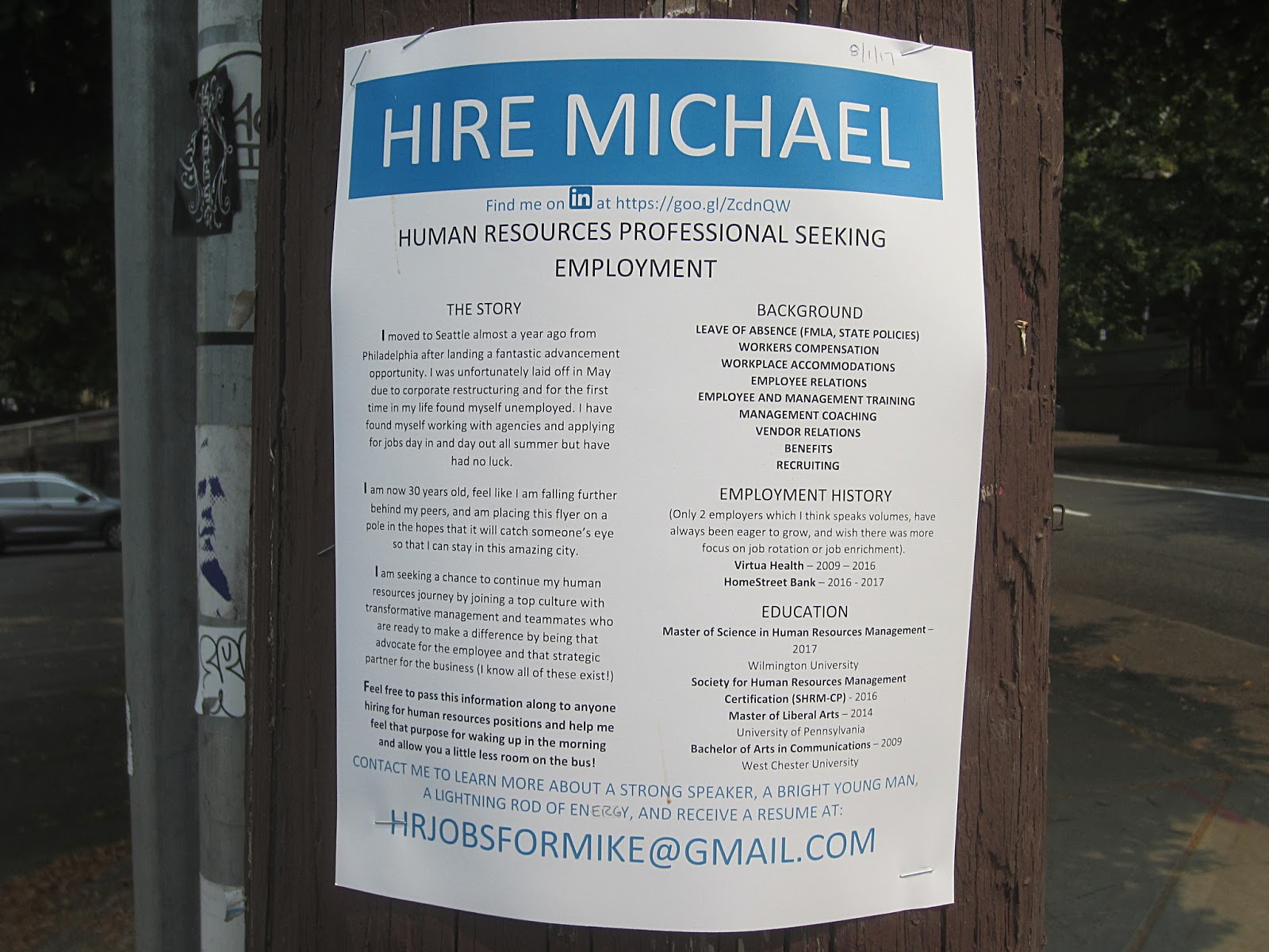 4. Вот этот знак даже попал в местные новости. Очень слезовыжимающая история от парня, который год назад приехал в Сиэтл из Филадельфии, поработал в HR, и его сократили: