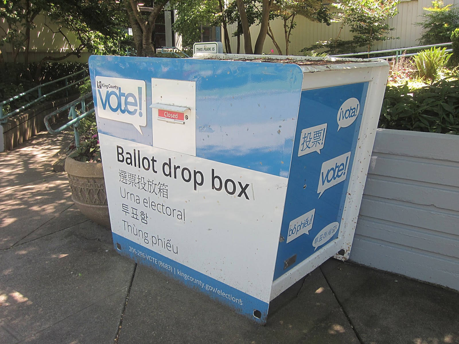 Голосование в Сиэтле проходит три недели. Бюллетени рассылают по почте, и их можно опустить вот в такие урны. Обратите внимание на 5 языков, на которых призывают голосовать (английский, китайский, испанский, корейский, вьетнамский).