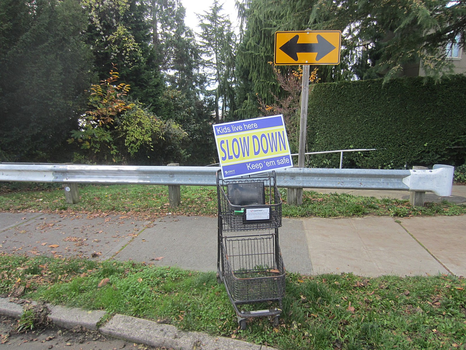 17. Kids live here - SLOW DOWN - Keep ‘em safe - и на тележке подпись Safeway. Почти корпоративный слоган: