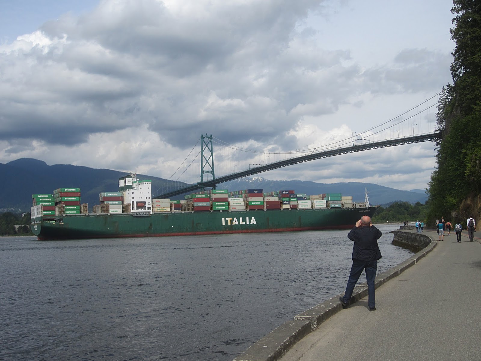 А потом по очереди плывут под мостом Lions Gate (построен в то же время, что и Golden Gate в СФ, но не такой знаменитый; надо было в красный цвет красить; или в желтый):
