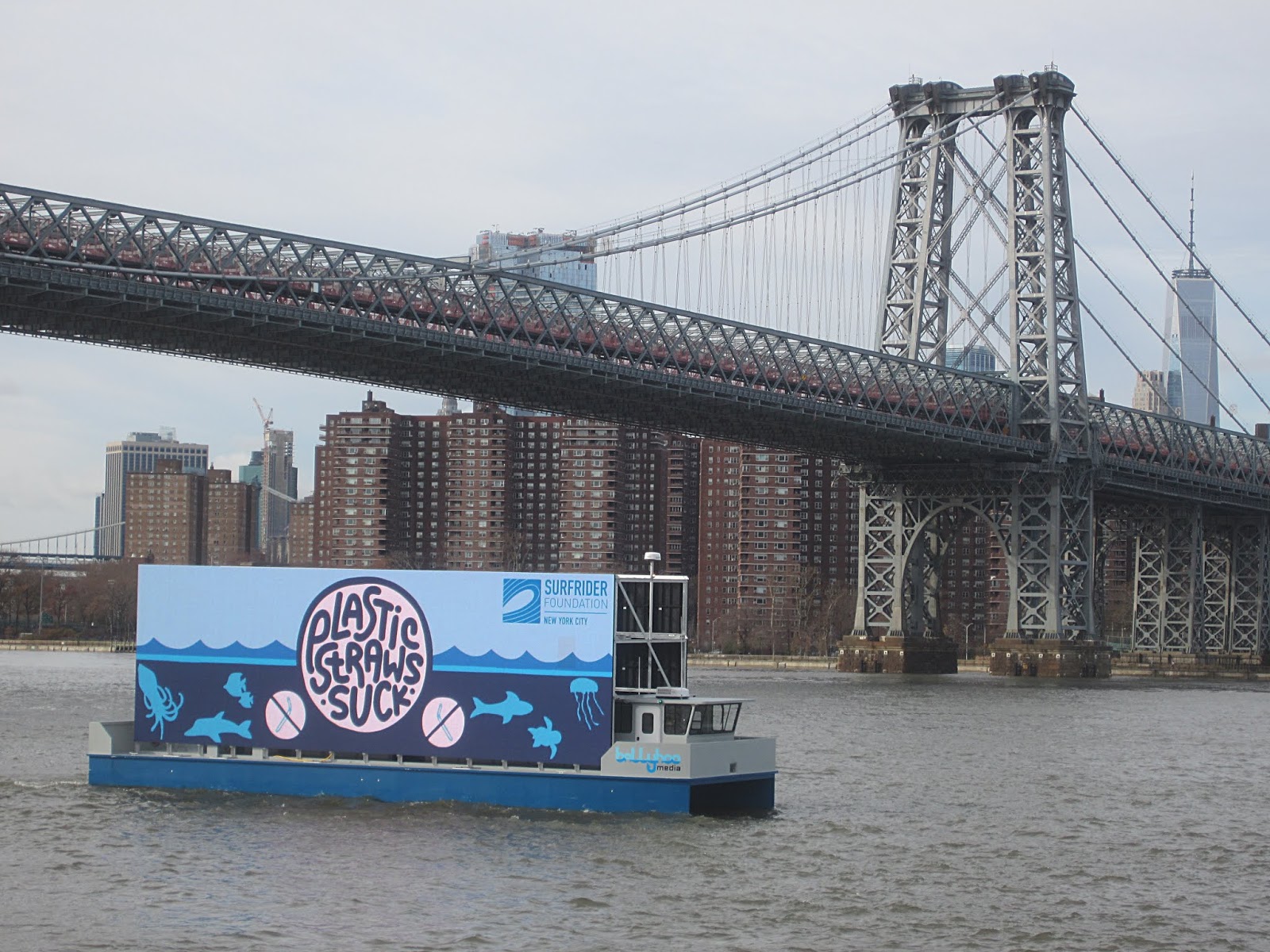А рекламный кораблик плывет мимо Вильямсбургского моста и в данный момент призывает запретить пластиковые трубочки для напитков: