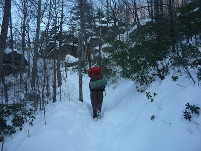 Нацепив рюкзаки, мы выдвинулись в первый поход в 2 часа ровно. Путь на Old Rag можно осуществить по круговой дороге общей длиной около 9 миль. Если идти по часовой стрелке, то подъем пройдет по извилистой и крутой тропе, а спуск и обратный путь по более пологой и прямой fire road (просека в лесу, используемая во время тушения пожаров и других спасательных мероприятий). Если идти против часовой стрелки, то два участка меняются местами. Мы выбрали первый вариант и углубились в заснеженный лес.