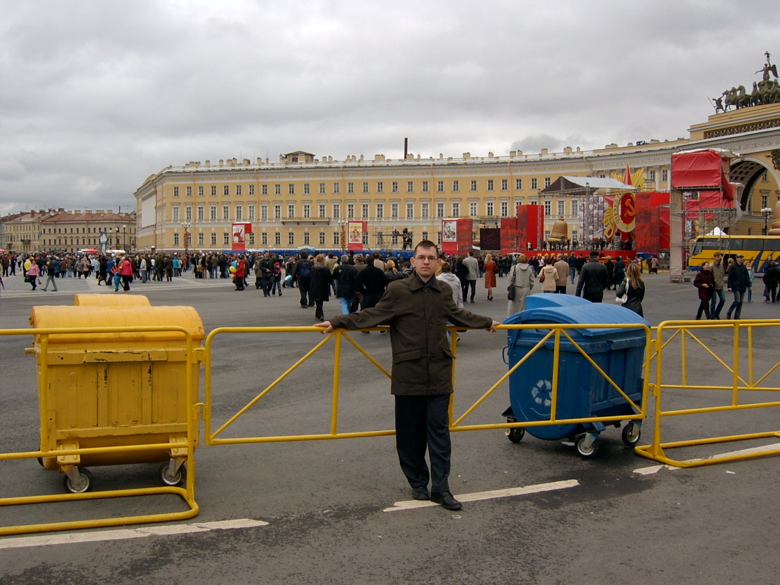 Нет нормальных фото меня на фоне Стрелки Васильевского острова или Исаакиевского собора. Я искал: все какие-то помойки, дворы-колодцы. Вот более-менее питерская: 9 мая 2005 года, я на Дворцовой площади.