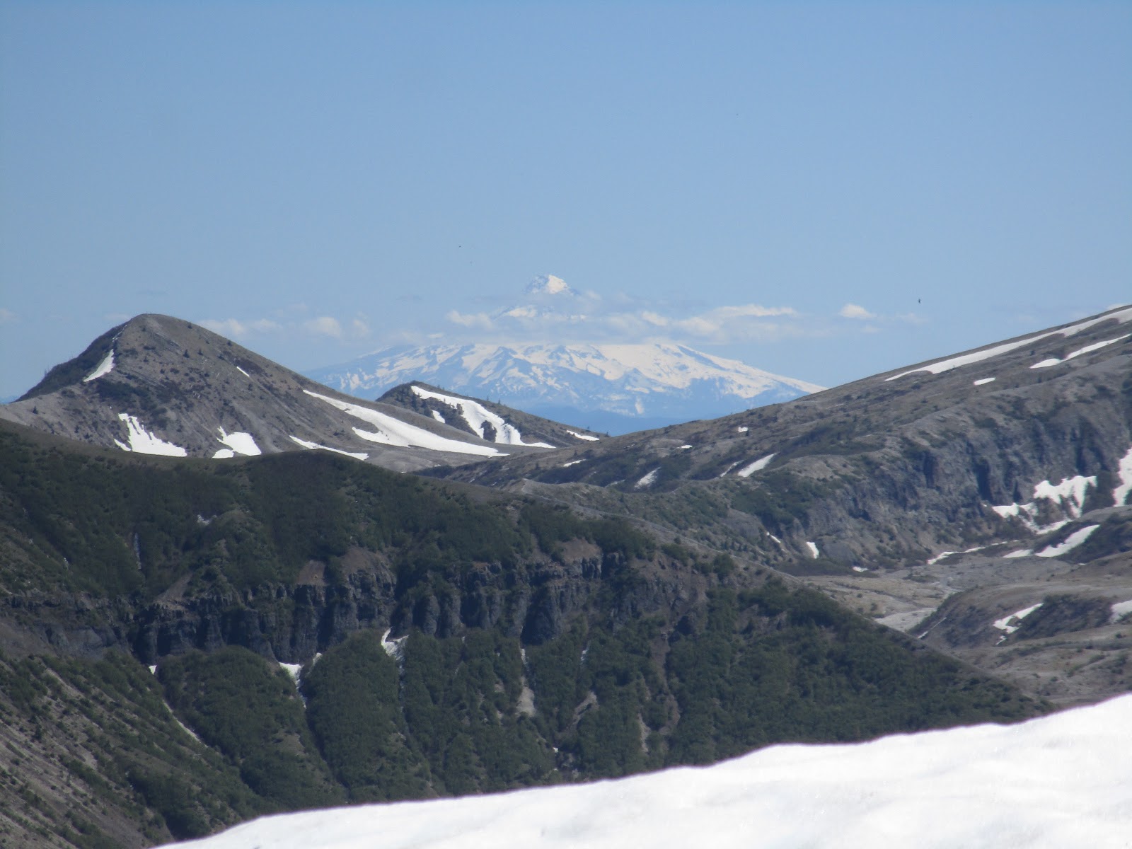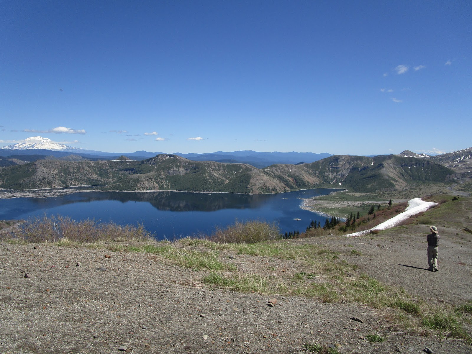 С хребта видно три больших вулкана. Сент-Хеленс с её разверзнутой северной стороны можно и с парковки рассмотреть. А вот, чтобы увидеть Адамс (вторая по высоте вершина Вашингтона) надо подняться повыше. Он расположен относительно близко от Сент-Хеленс, и в ясную погоду возвышается снежной шапкой за Spirit Lake.