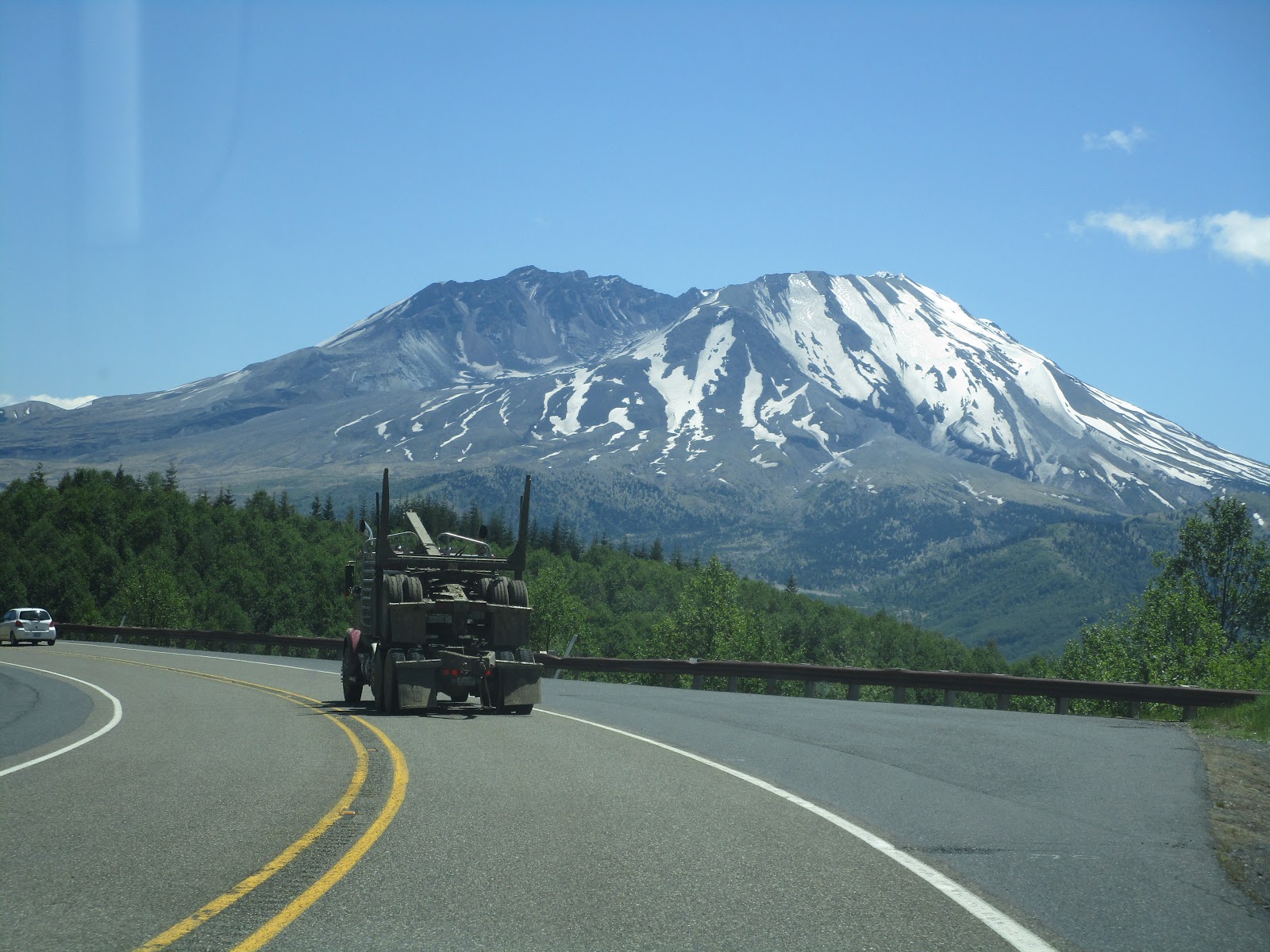 Ехать от нас до созданного в 1982 году Mount St. Helens National Volcanic Monument 3 часа. Слишком далеко на наш вкус для поездки на один день туда-обратно. Поэтому всё ждали, когда представится случай поехать на юг по шоссе I-5 и заодно заехать на St. Helens. Представился не случай, а объявление, что в четверг 17 июня наш гараж будут мыть и просят в этот день убрать все машины. Значит, мы едем в путешествие дня этак на три. (Вымыли гараж ожидаемо плохо; лужи будут сохнуть ещё несколько дней, хорошо ещё, что наше место осталось сухим).