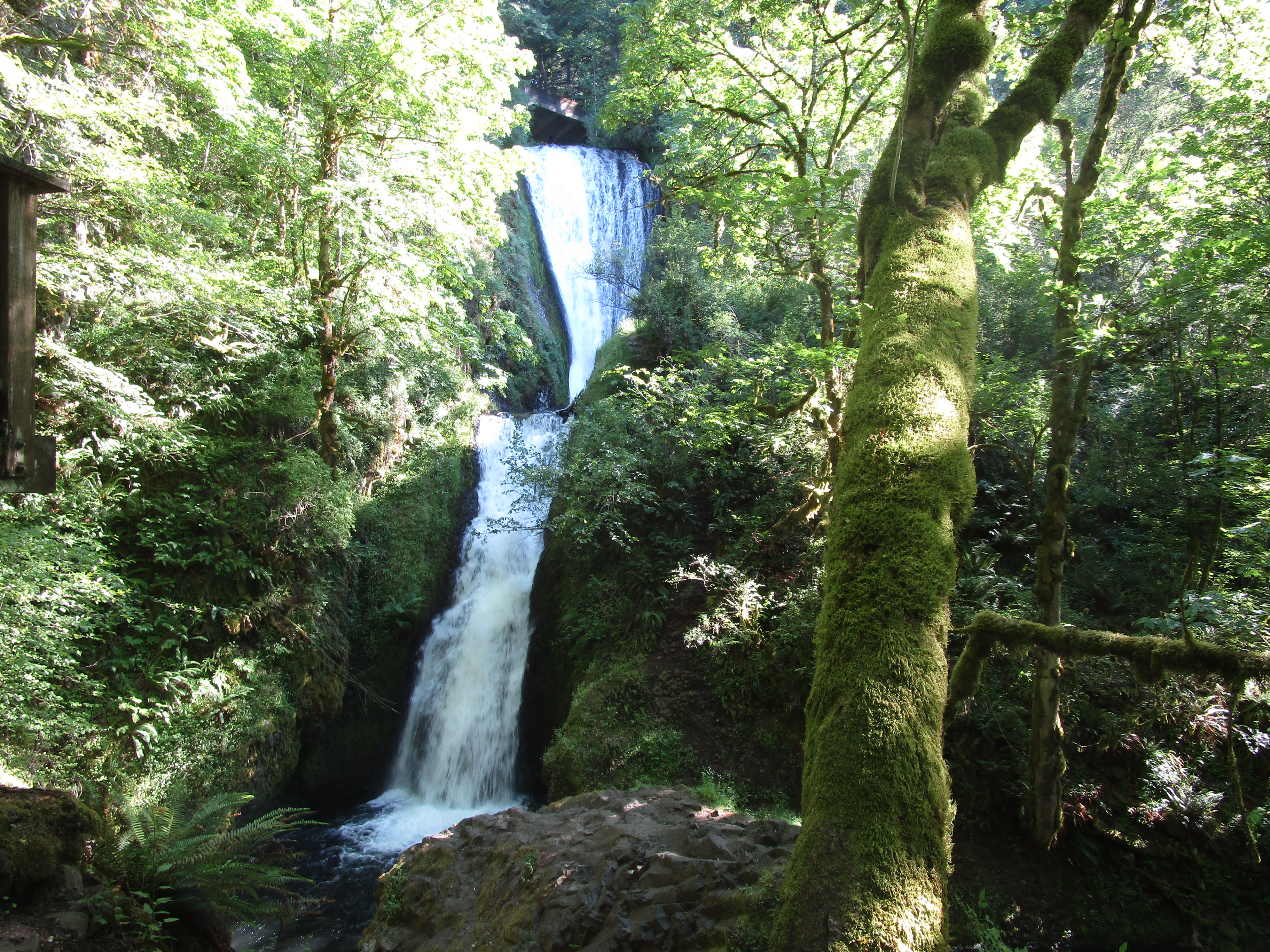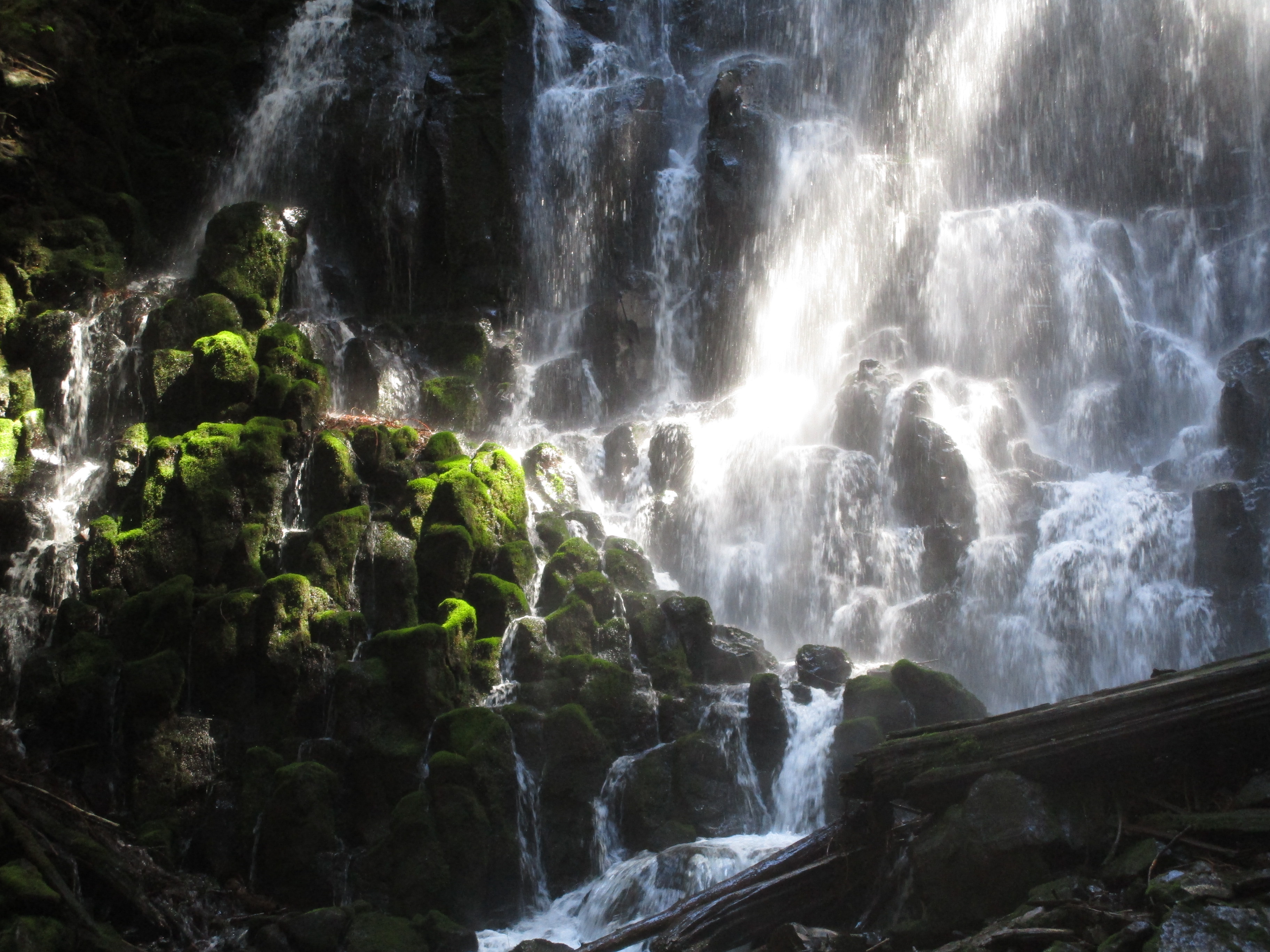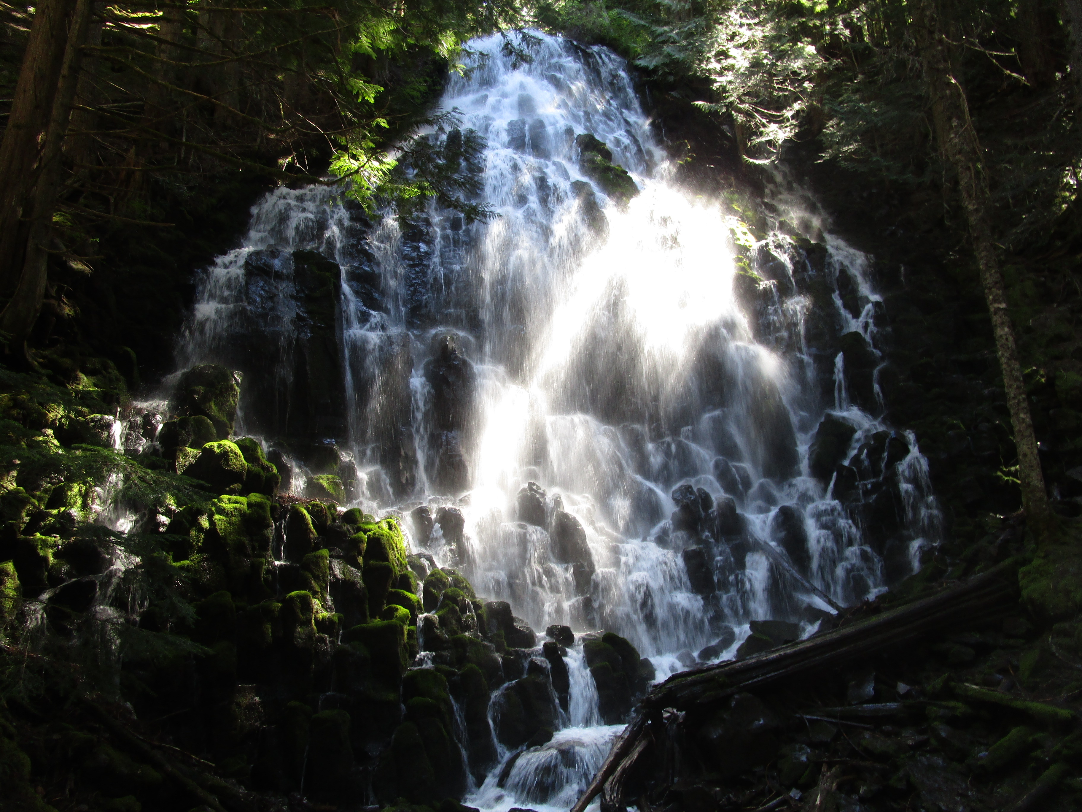 В тени густого леса у водопада было темно, но пробившийся сквозь деревья солнечный луч красиво подсвечивал струи воды и покрытые зелёным мхом камни. Посещение Ramona Falls горячо рекомендую: это всего час езды от Портленда. А если боитесь пересекать бурный поток, то по карте мне кажется, что к этому водопаду можно прийти и по другой, более долгой тропе, зато без переправ: