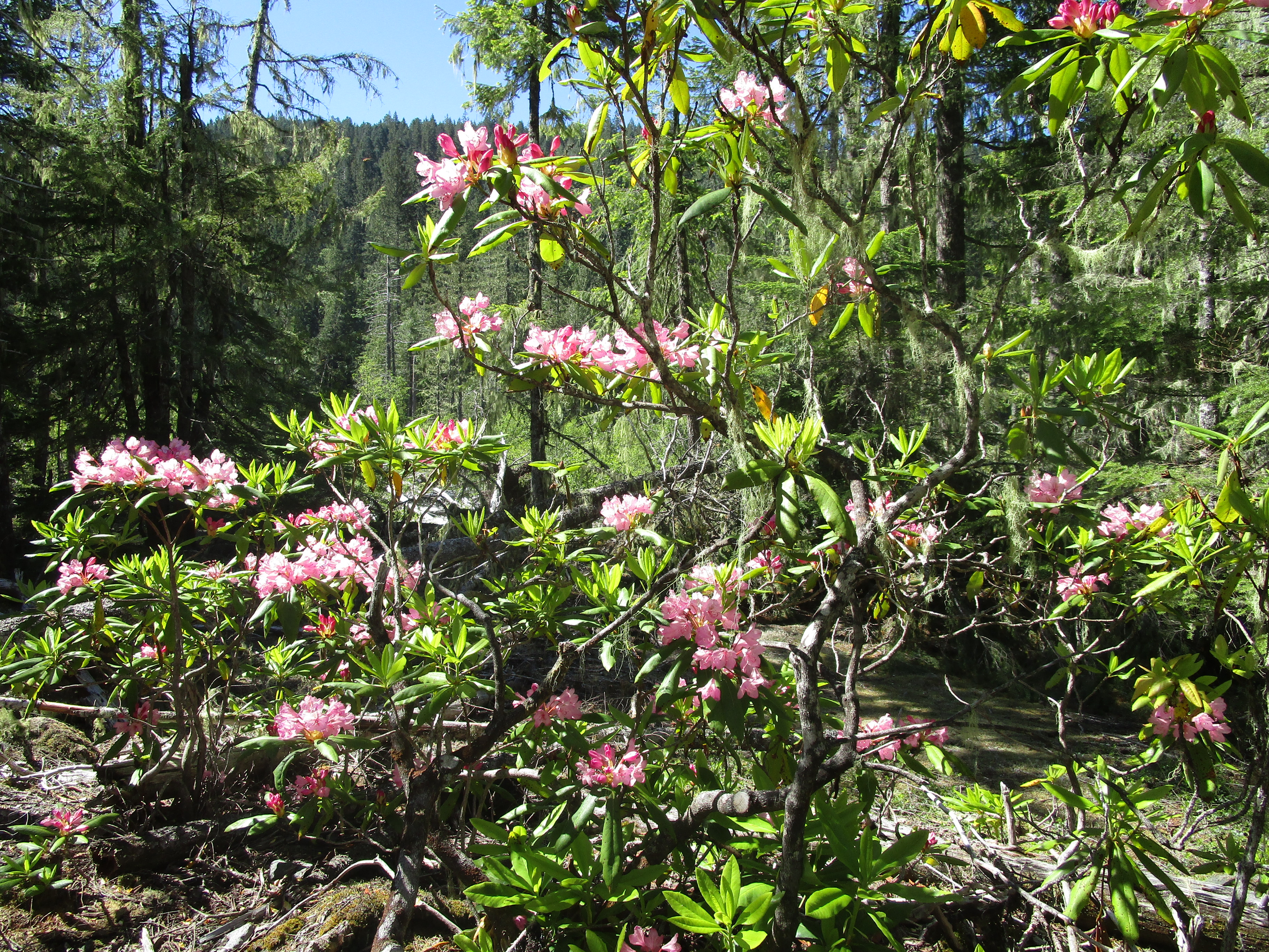 После реки тропа до водопада покажется очень простой и плоской. Цветущие рододендроны оживляют июньский пейзаж: