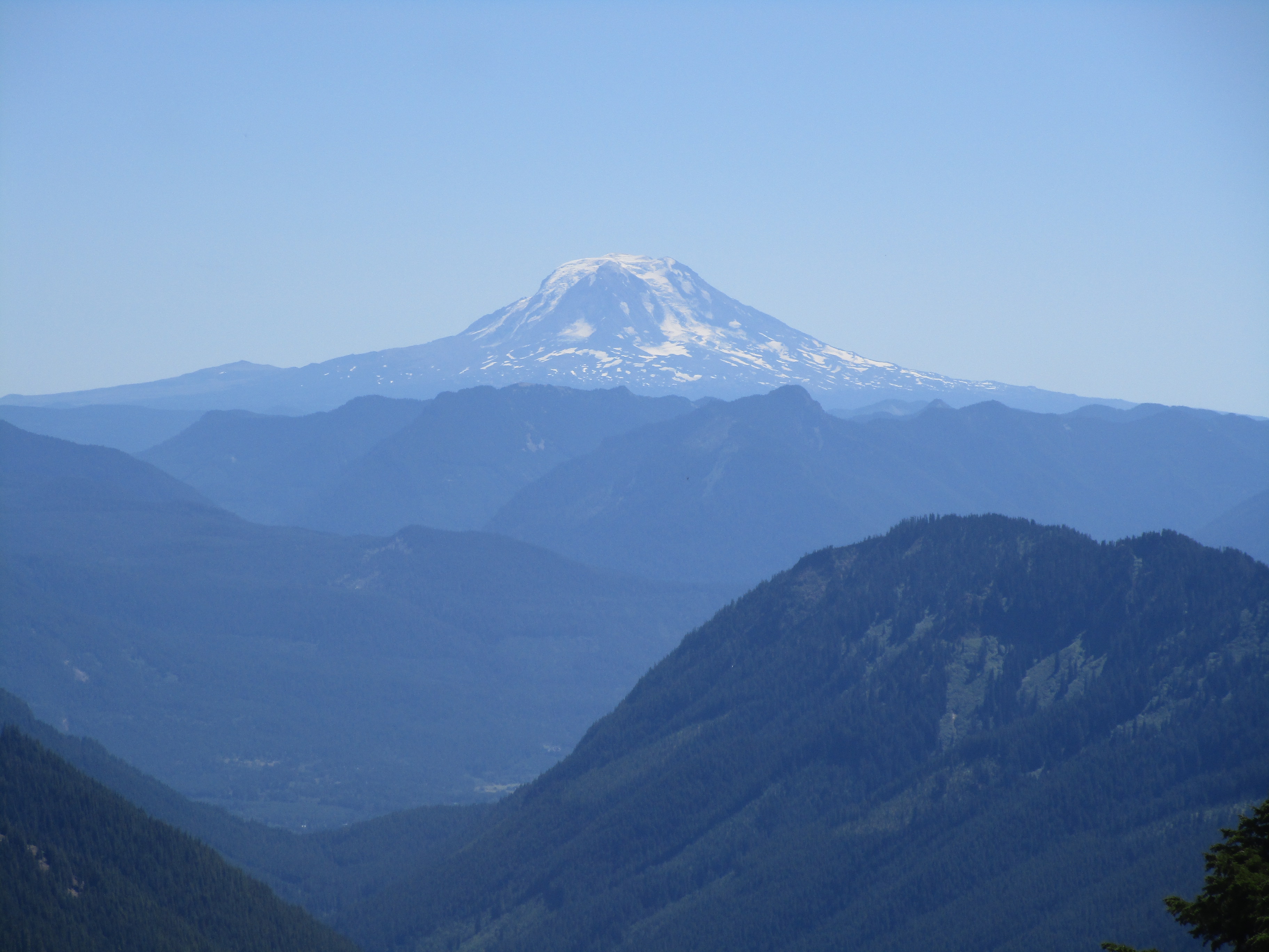 Главное везение этой поездки в том, что до Рейнира не дошёл дым от многочисленных лесных пожаров в западных штатах. Ветрами его отнесло на восток, и мы наслаждались голубым небом и видами соседних гор и вулканов на десятки миль кругом. Следующая фотография на переднем плане показывает хребет Татуш (Tatoosh Range):