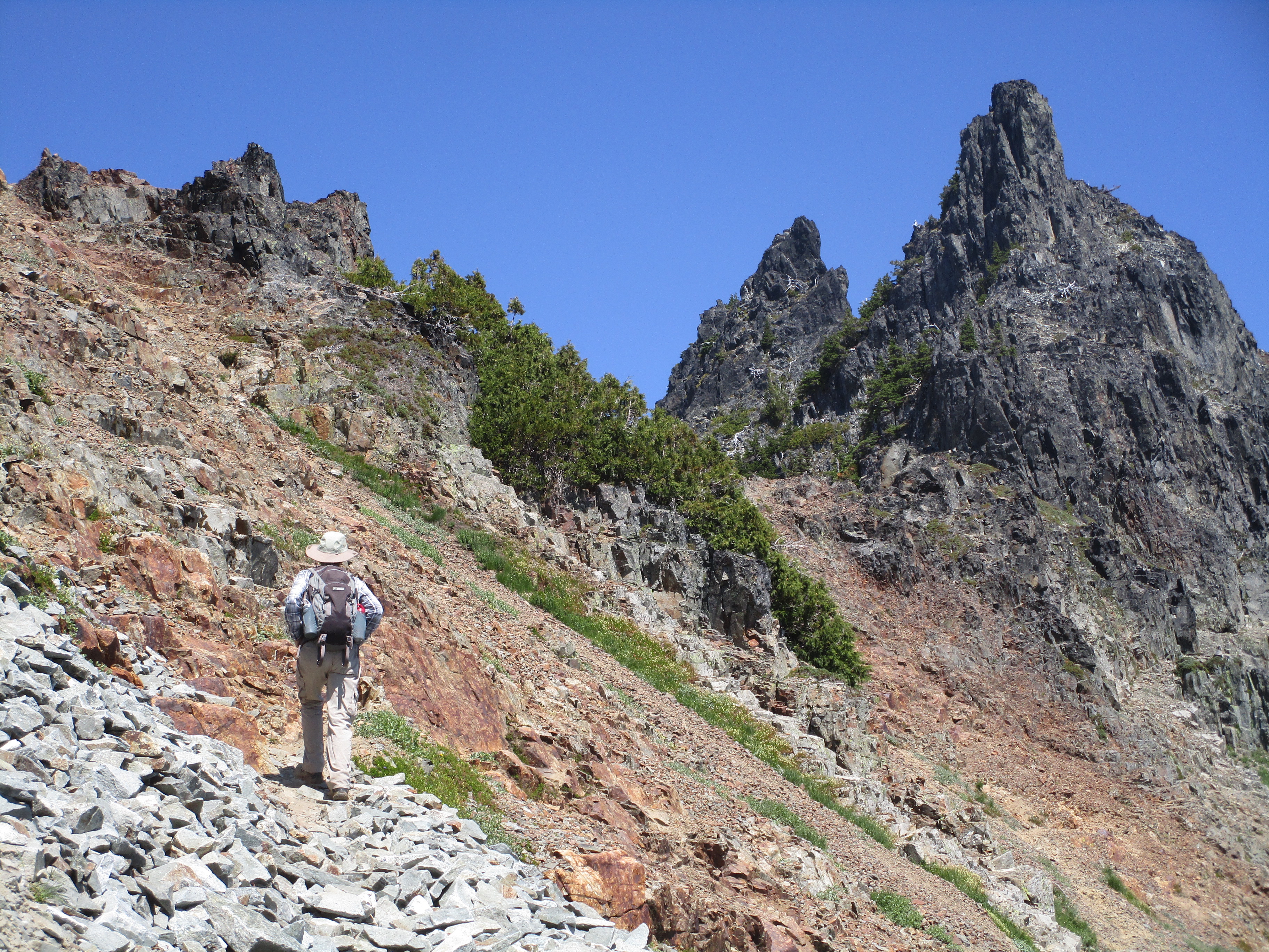 В четверг же мы начали подниматься на перевал Pinnacle Saddle – один из самых красивых и при этом коротких трейлов в парке. Сзади возвышается огромный снежный горб Рейнира: