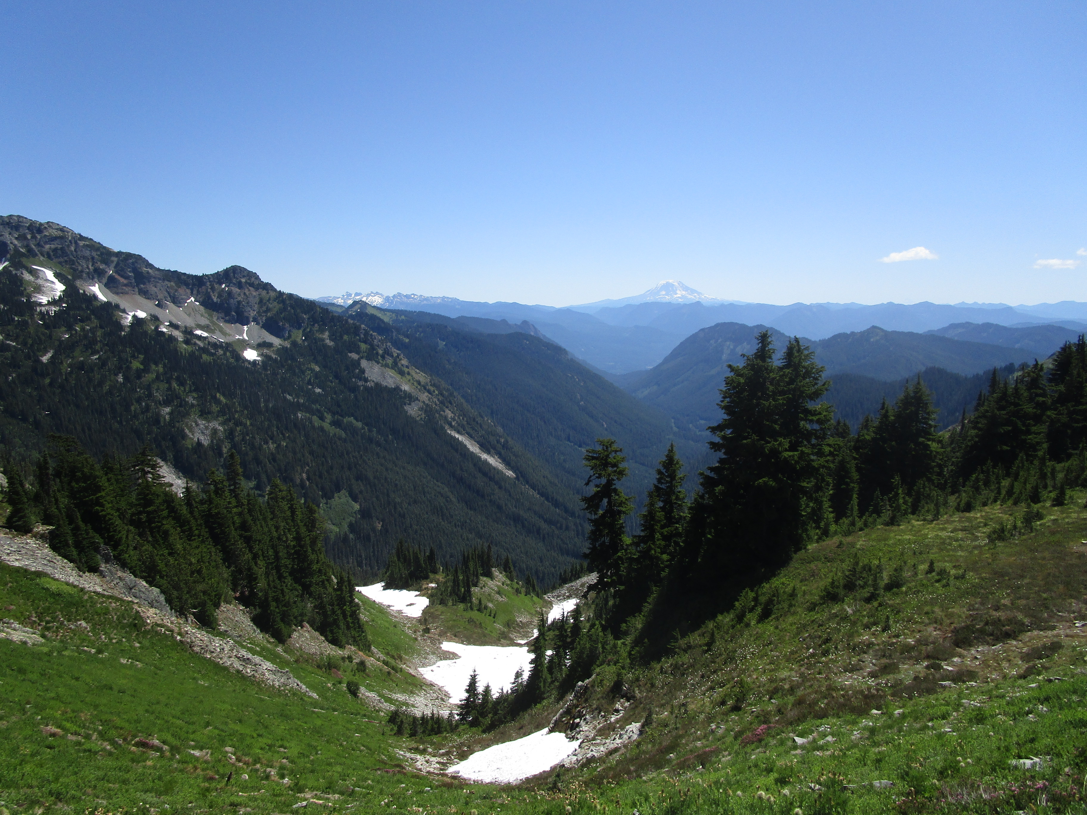 Не менее впечатляющий вид открывается за самим перевалом: по центру гора Адамс, слева снежные вершины Goat Rocks (Козлиных скал) и глубокая долина, где зелёная трава соседствует с белым снегом: