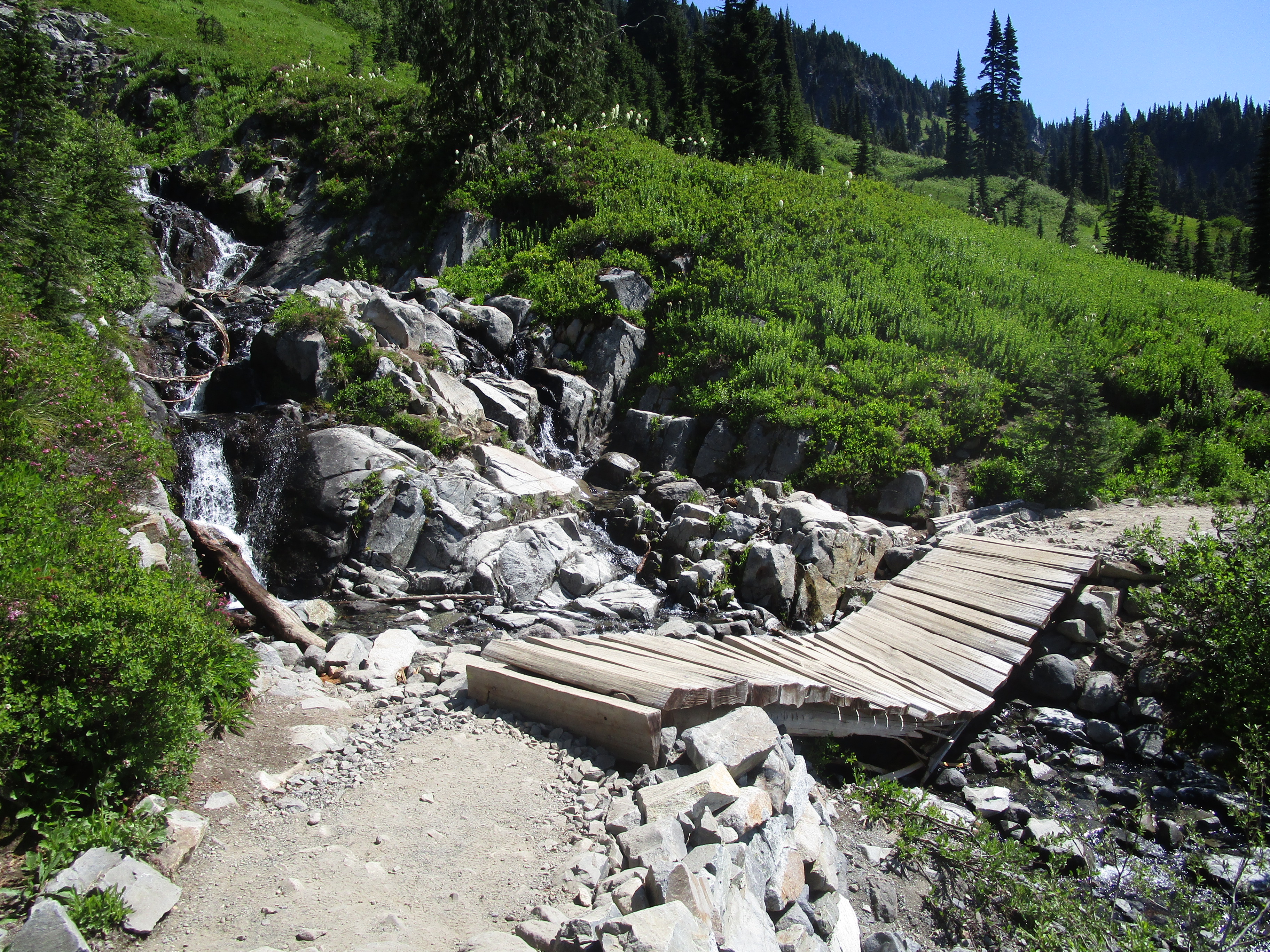 Тем более, что я читал отчёты на сайте вашингтонских хайков, что по пути к Comet Falls мостик снесло потоком и ручей надо переходить по бревну. Неудивительные новости, если учесть плачевное состояние некоторых мостов на Skyline trail: