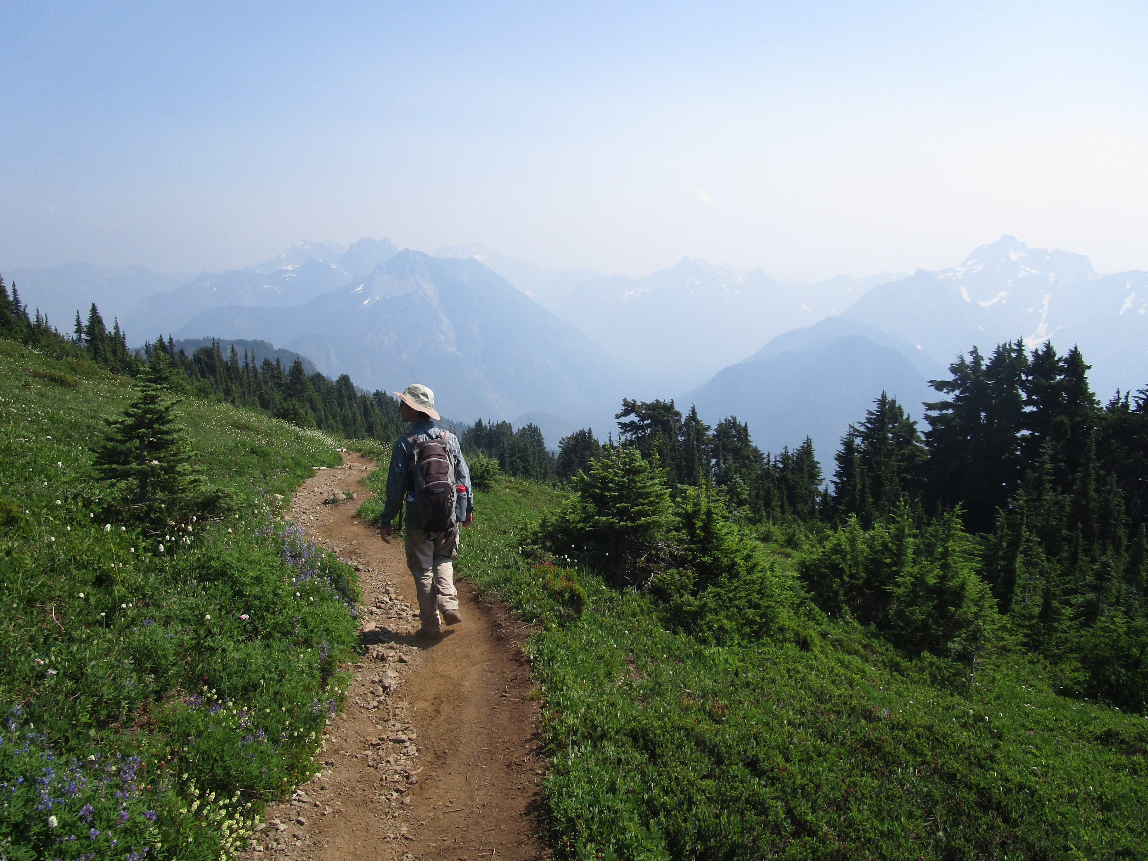 Подъём на Дикерман скучный, так как первые два часа идёшь по густому лесу безо всяких видов. Потом выходишь на открытые луга, но разнообразие цветов уступает трейлам возле горы Рейнир, куда нам удалось попасть до дыма: