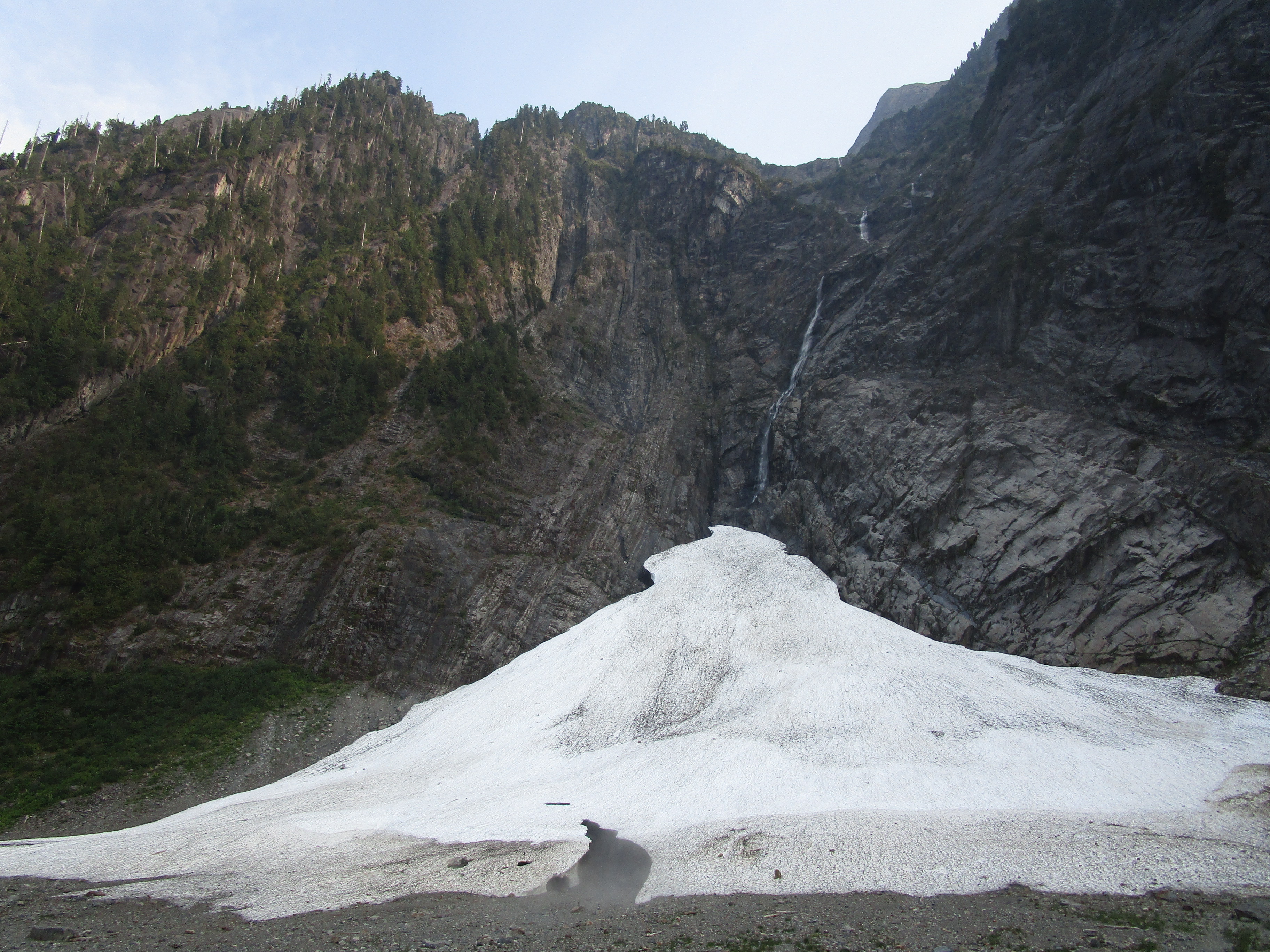 Такие пещеры образуются в снегу у северного подножия гор, слежавшегося до состояния льда, когда через него пробиваются стекающие каскадами ручьи. Каждый год пещеры выглядят немного по-разному, и, как вы можете видеть, они сохраняются до августа: