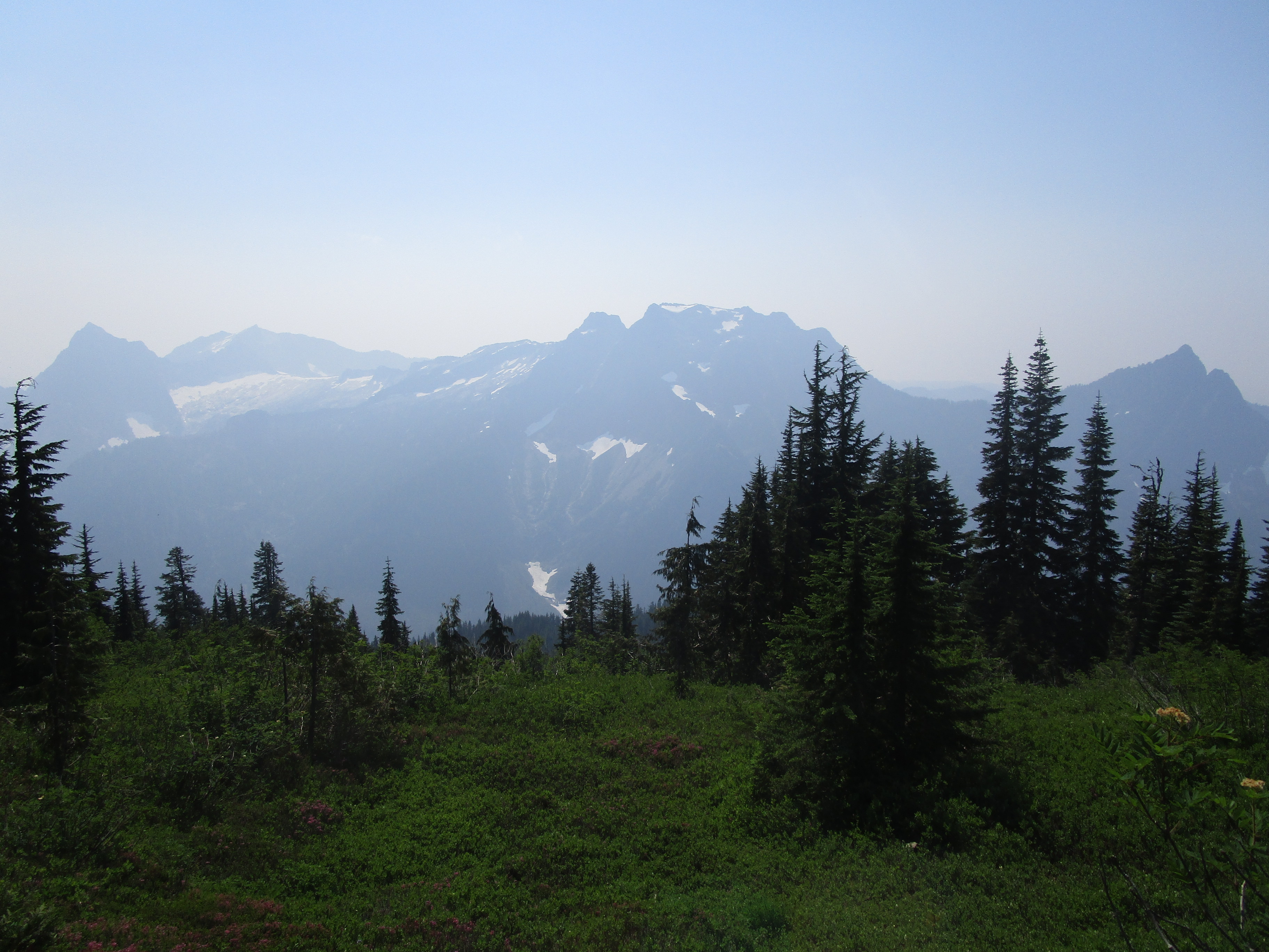 Но стоит сравнить с фотографиями, сделанными без дыма, чтобы понять, как много мы потеряли. На моём фото за выпирающей скалой слева просматривается то ли облако, то ли пыль на объективе, а на снимке с реддита, сделанного в июне 2017 года, чётко видно, что это проглядывает вулкан Glacier Peak:
