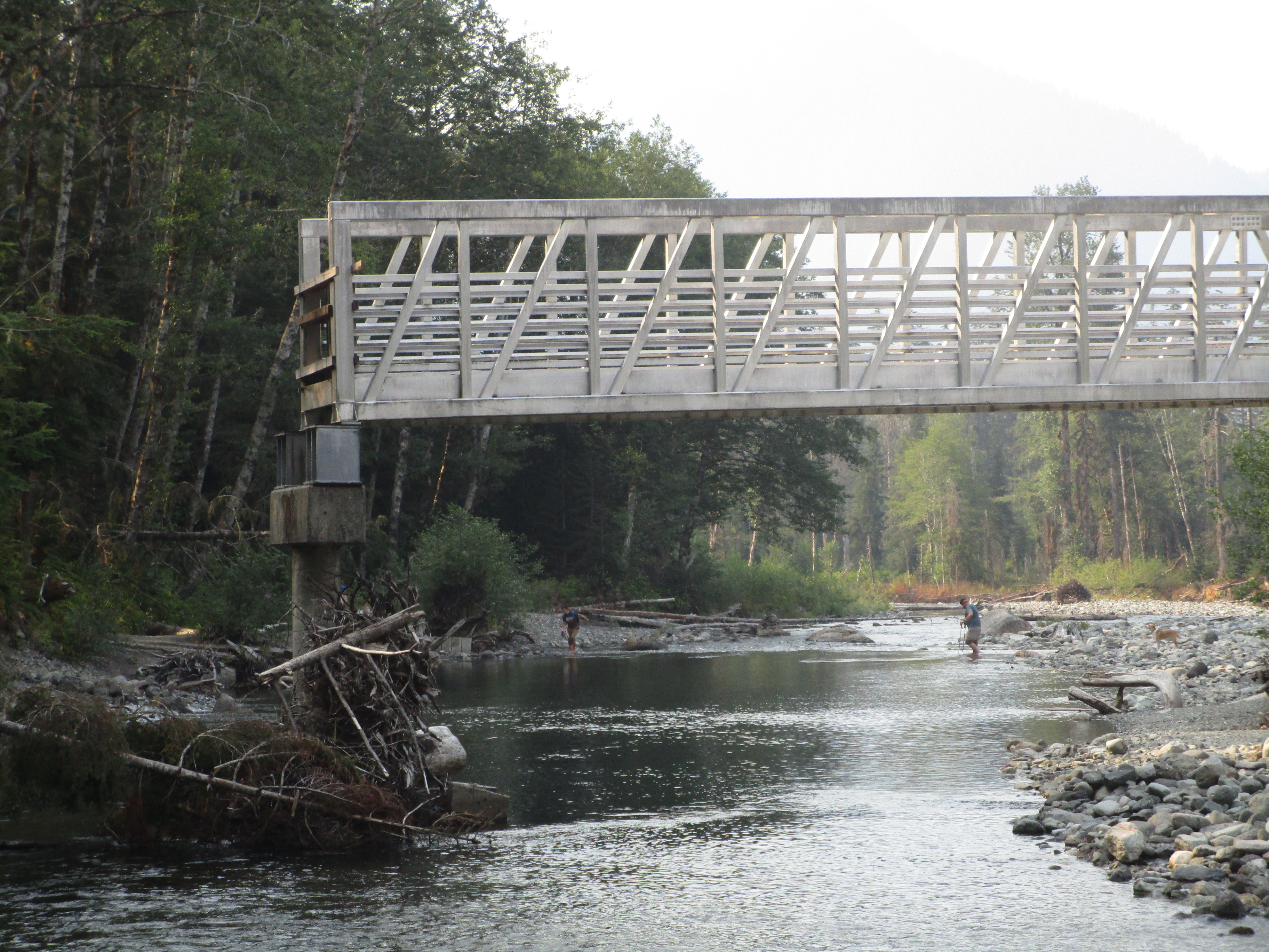В августе после почти рекордных 50 дней без дождя в Сиэтле перейти реку легко. Течение не сносит, как было при пересечении реки Сэнди на пути к водопадам Рамона. Температуру воды мне оценить сложно, но не очень холодная, градусов 15 ºC. Мы, не зная брода, вначале пошли слева от моста (если смотреть от начала тропы), где было значительно глубже, чем если бы мы пошли справа, где переходят все остальные (там мы перешли на пути назад):
