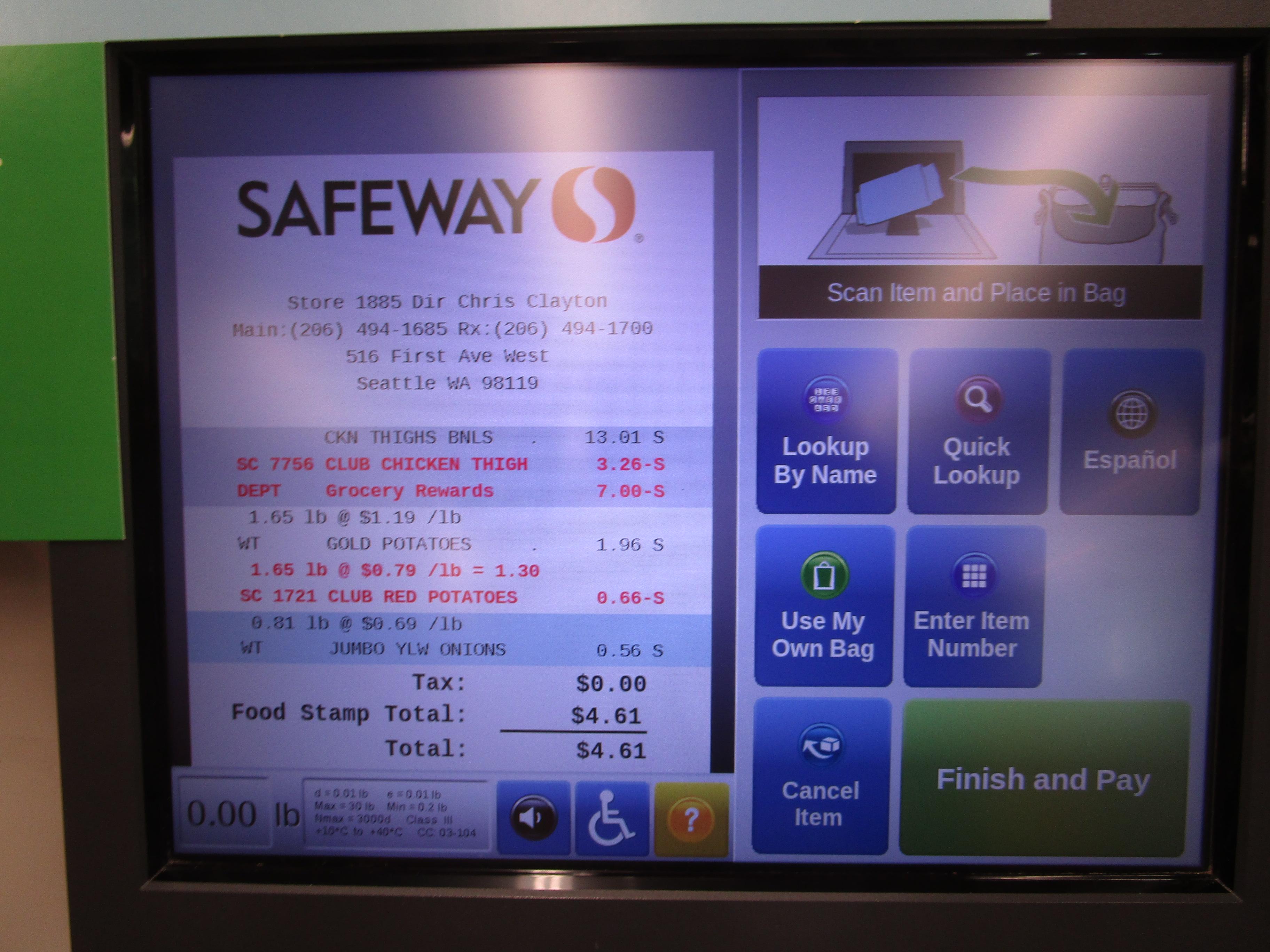 Мы купили эти 3,26 фунта (1,5 кг) за $2.75, но потому что у нас был купон «–$7 на мясо». Я уже писал о сложной системе купонов в магазинах Сиэтла. Конкретно эту «награду» можно получить за 400 очков, которые набираются при других покупках в Safeway (от 1 до 3 очков за потраченный в магазине доллар в зависимости от того, что и когда покупаешь). В общем, реально это мясо стоит $9.75, и его тоже хватит на 8 порций, увеличивая стоимость обеда на $1.25: