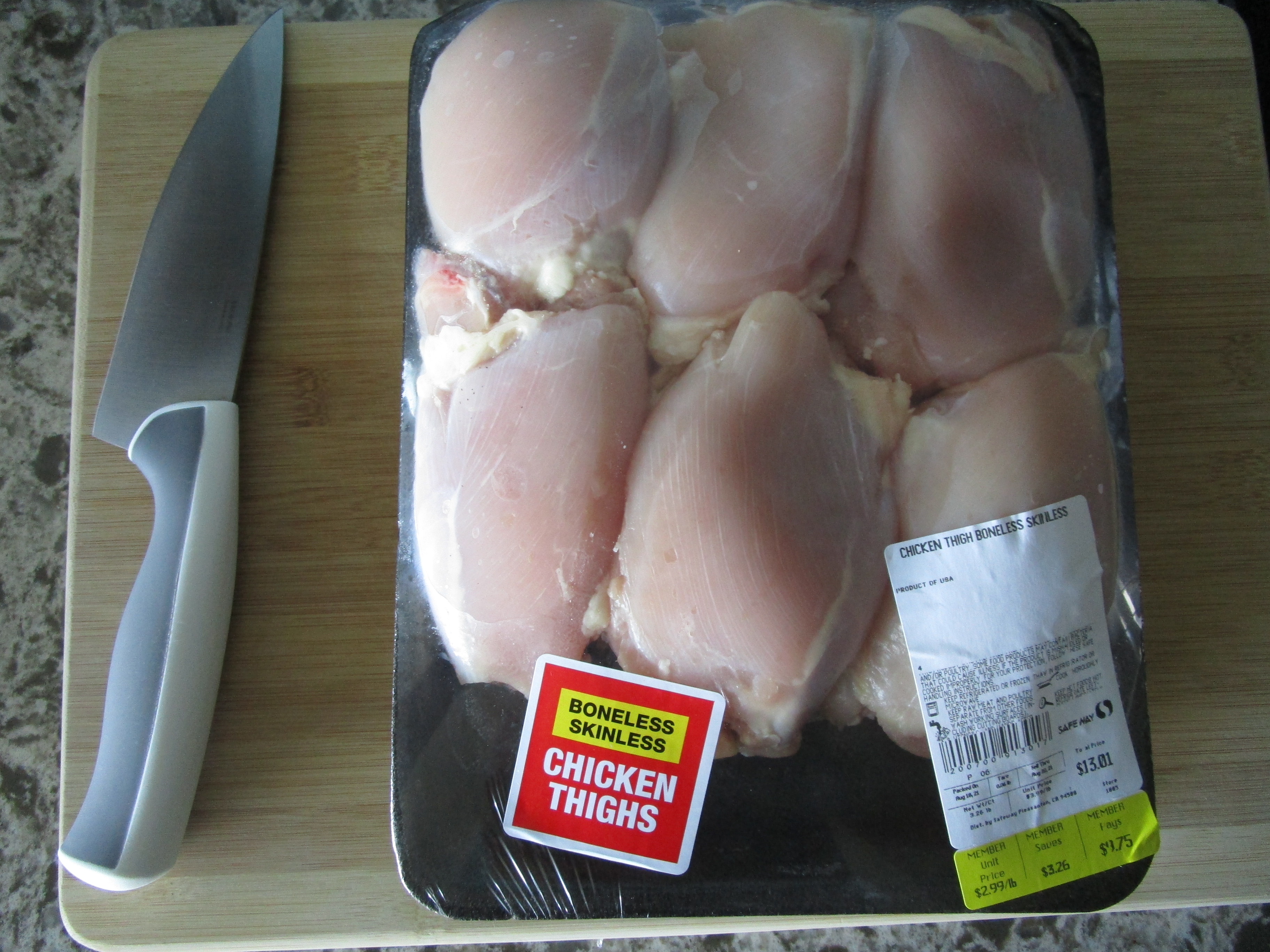 Параллельно с овощами готовилась курица. Я буду считать, что Chicken Thigh Boneless Skinless (бескостные бёдрышки) стоят $2.99/фунт (480 руб/кг). Раньше нормальная цена была $1.99/фунт, но куриное мясо сильно подорожало за последний год. Пишут, что из-за спроса со стороны Макдональдса и других фаст-фудов. Мы предпочитаем бёдрышки, а не грудки, которые красивые, но безвкусные: