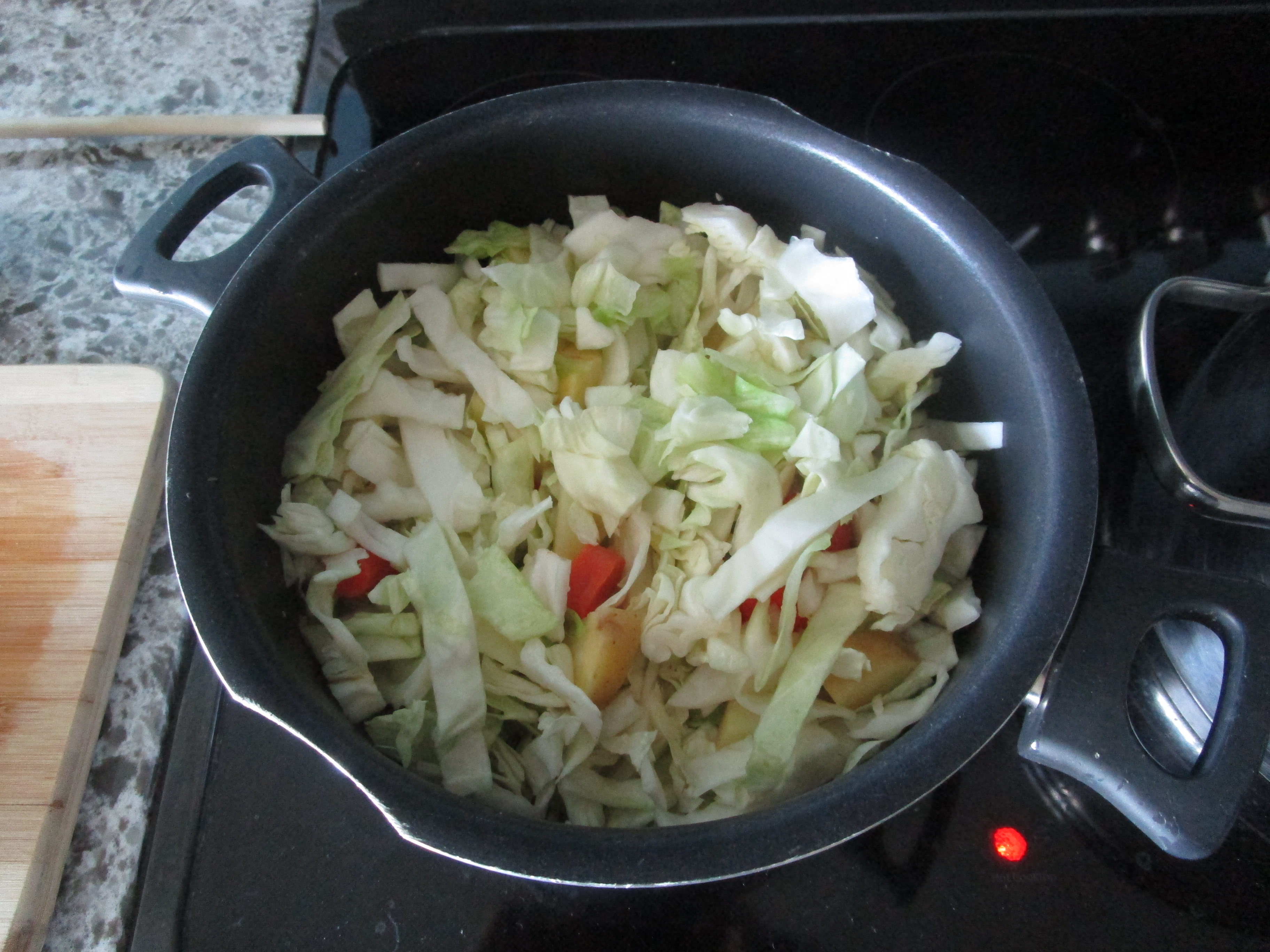 Получается полная кастрюля еды, но капуста в процессе готовки «осядет». Я солю промежуточный продукт, добавляя примерно пол столовой ложки хлорида натрия. Можно взять перерыв на 30 минут: