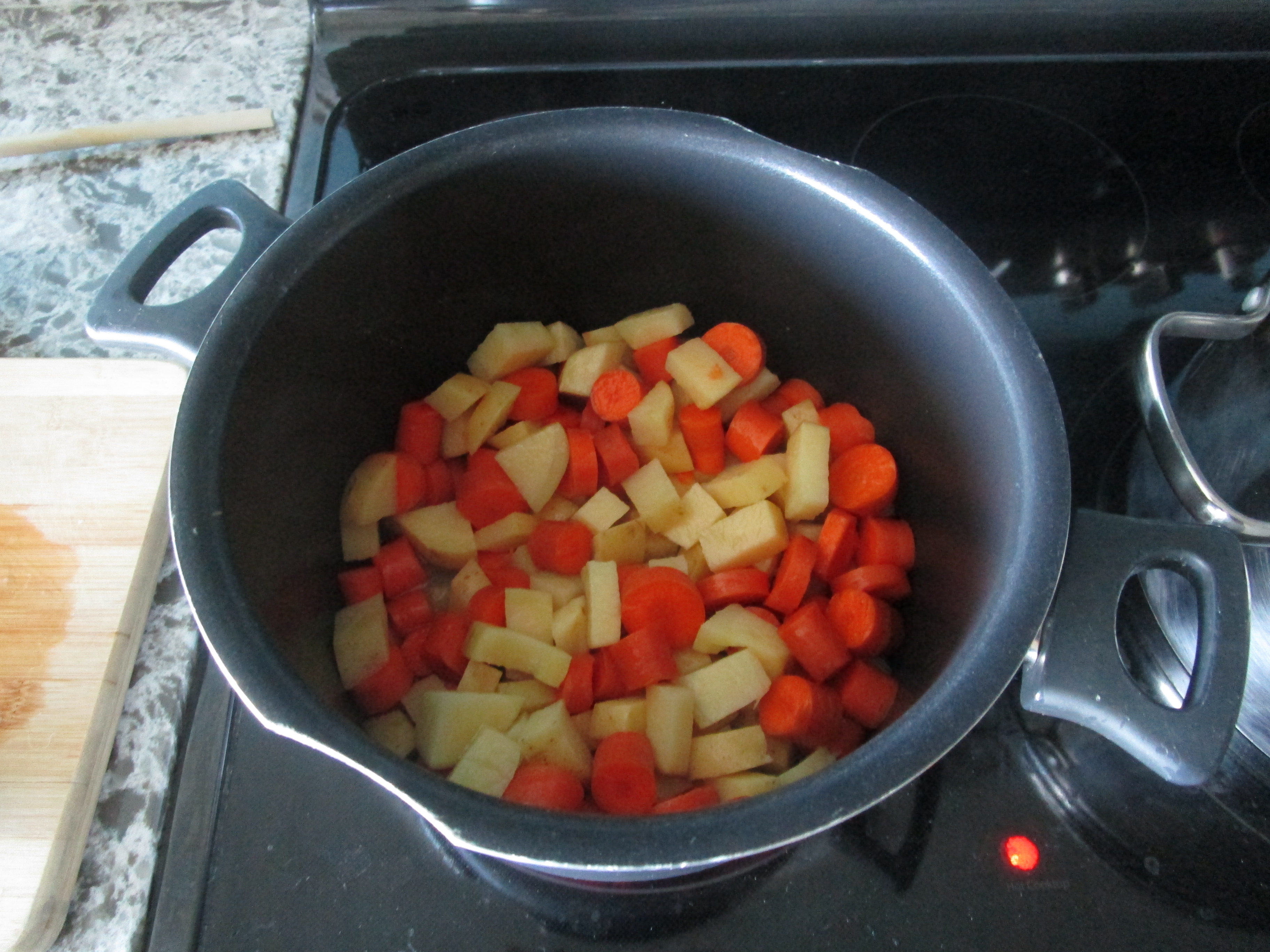Нарезаю три картофелины. Gold potatoes, стоят по скидке $0.79/фунт (130 руб/кг), начинаем считать стоимость блюда – $1.30. Можно использовать и white potatoes, главное, что не большие Russet potatoes, которые часто гнилые. «Золотую» картошку можно резать «как есть» и особо не чистить. К картошке добавляю 4–5 морковок (это где-то фунт; два фунта стоят обычно $1.79 (145 руб/кг); прибавляем $0.90). У них отрезаю только кончики. Я вообще люблю крупно нарезанные овощи, как в азиатских ресторанах, поэтому тёрок не держим: