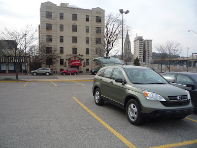 Заехали в Giant Eagle. Они там переставили некоторые товары, и мы минут десять искали чай в пакетиках, который дома почти кончился. Когда нашли, пришли на кассу, касса сломалась. Хорошо, что можно было перейти с кассиром к другому аппарату и не стоять в очереди заново. Мы вообще более-менее перешли на то, что ездим за основными продуктами по вторникам или средам утром, когда никаких очередей нет. А тут решили закупить яблок (которых никогда не бывает много), гранатового сока, hot сальсы и чай. В этот раз я не удержался сфоткать другую green tea Honda CR-V 2009, которую часто можно видеть неподалеку от Giant Eagle'а.