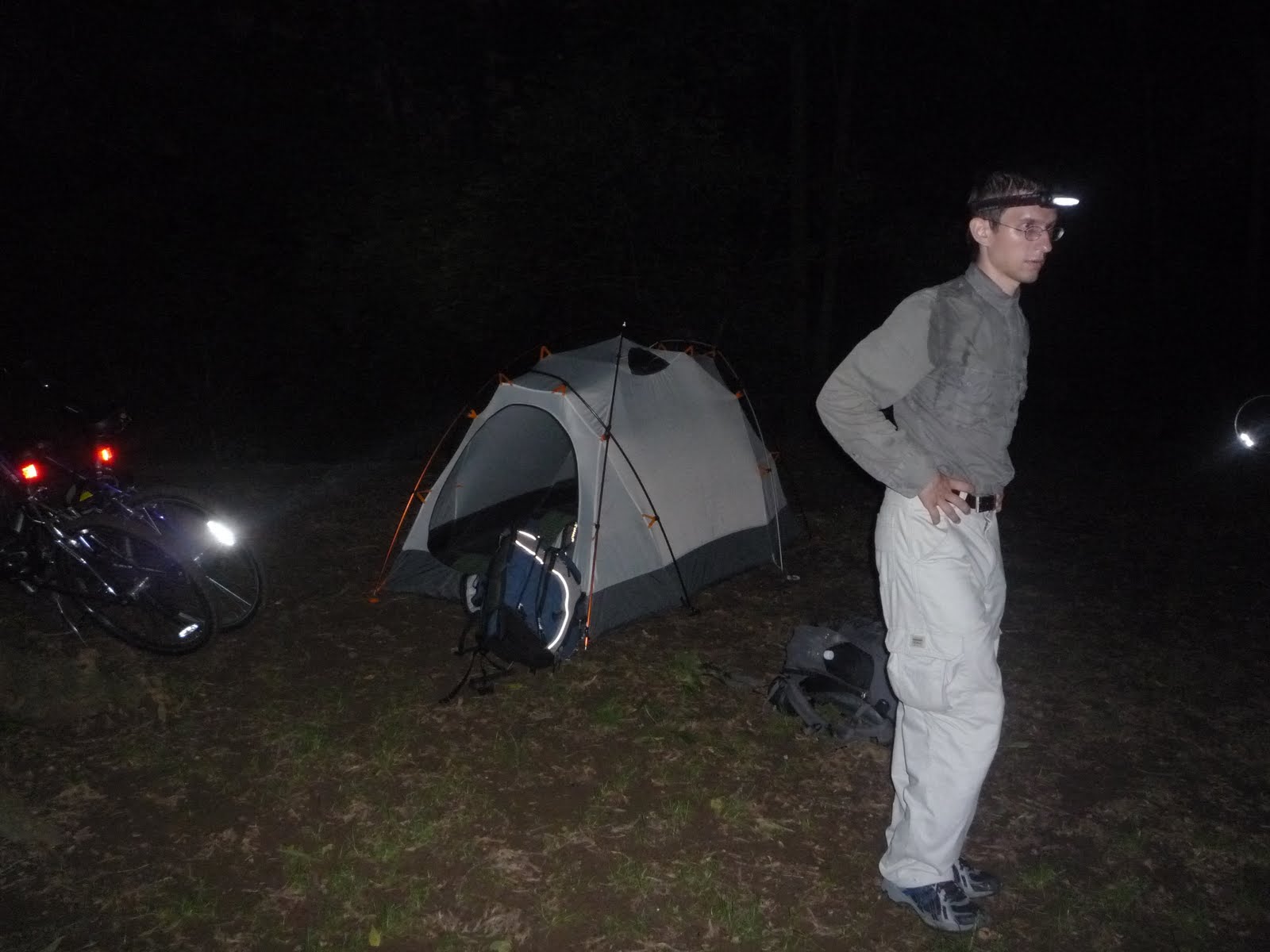 Никаких резерваций или оплаты не требуется: приехал и занял свободное место. Когда в уже полумраке мы добрались до campground'a, там было оживленно. Место для нашей палатки, конечно, нашлось, потом еще люди продолжали приходить, но такая толкучка контрастировала с нашими предыдущими одинокими ночевками в лесу. Если бы мы могли проехать еще 4.5 мили, то оказались бы на пустом кэмпграунде (на утро там была всего одна палатка), но нам и так сразу пришлось надевать на лбы лампы, а утром мы увидели, какая бы грязь нас поджидала. Так что поставили мы по-быстрому палатку, связали из излишней предосторожности замком два велосипеда и забрались внутрь. Съели по два батончика и стали засыпать.