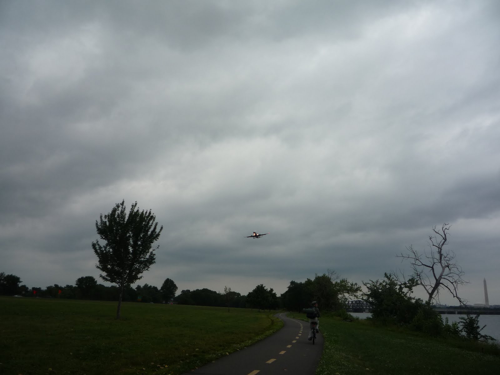 К пяти часам мы наконец были в седлах. Но даже до C&O Canal Trail’a еще надо было проехать около 6 миль по заасфальтированному Mount Vernon Trail’у, который тянется вдоль правого берега Потомака. Проехали очень близко от Ronald Reagan Washington National Airport, расположенного там же на берегу. То и дело над нашими головами садились самолеты.