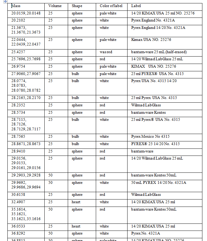 Все равно время от времени из-за спешки и путаницы я забывал взвесить колбы заранее. Приходилось их мыть, сушить, запоминать и взвешивать постфактум. А так как колб у меня не так уж много, и я их использую многократно, то в какой-то момент пришло логичное решение взвесить все колбы и узнать их вес раз и навсегда. Так был создан файл My flask.wps. Так как веществ получаю я до 100 мг, то обычно массы достаточно для однозначной идентификации колбы: если брутто на 50 мг больше известного «пустого» веса, то эта колба и есть. Но для большей уверенности я собрал все признаки колб в таблицу: размер (25 или 50), форма (sphere or bulb), цвет надписи (красный, белый или стершийся), сама надпись (вроде 14/20 KIMAX USA 25 ml NO. 25276).
