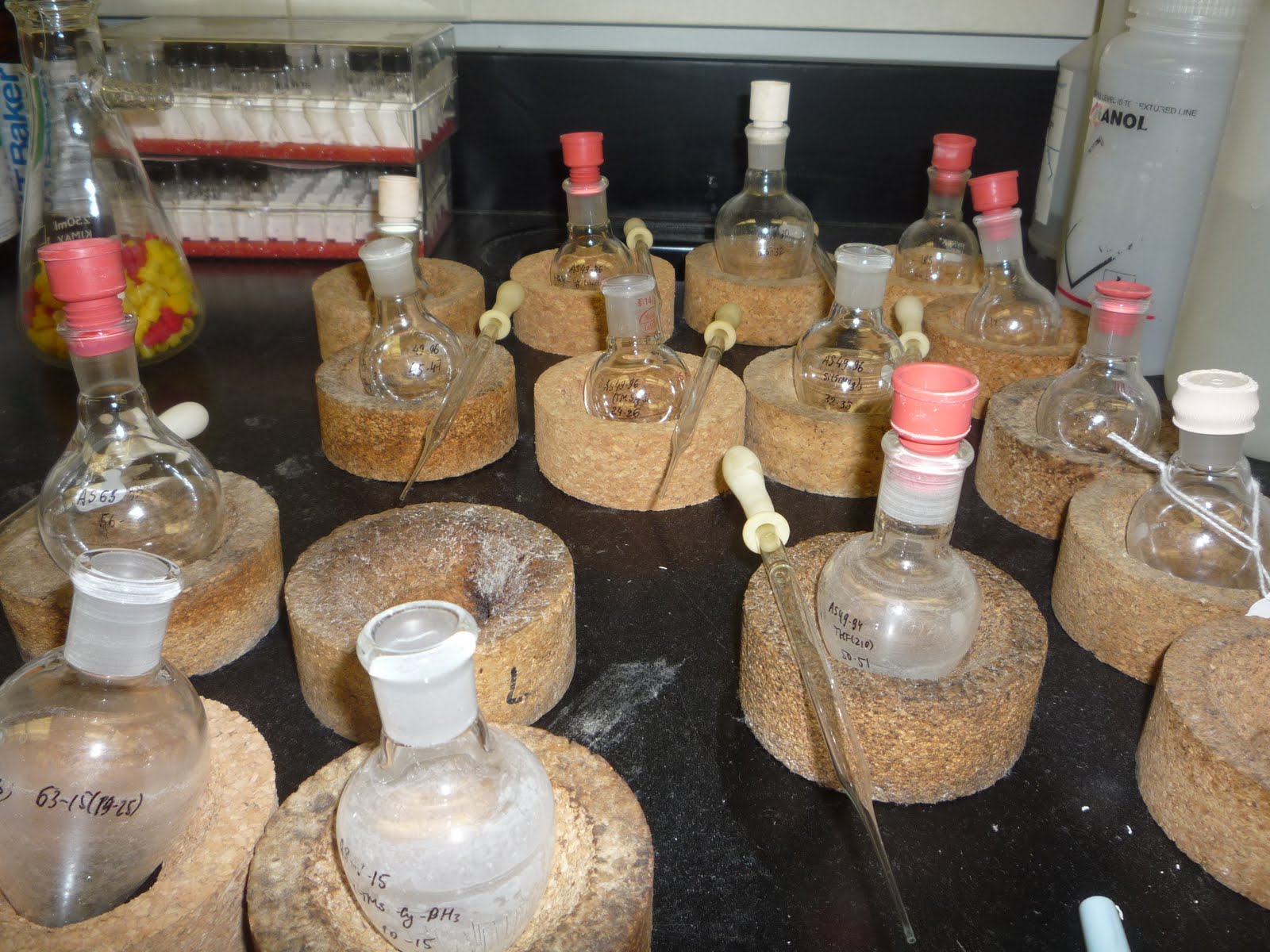 Одна из самых рутинных операций в лабе – объединение фракций после колонки. Те, что чистые по ТСХ, сливаются в одну колбу, после чего растворитель упаривается на роторе. Некоторые (Жульен) предпочитают вначале собрать все в большую колбу (250-500 мл), сконцентрировать, а потом перенести в удобную маленькую колбочку. Я же, если количество фракций не превышает пятнадцати (одна фракция не более 10 мл), предпочитаю сразу начинать с колбы на 25-50 мл, отгоняя фракции по 2-3 за раз. Беготни, конечно, больше, зато я могу быть уверенным, что вещество не останется размазанным в большой колбе и, что важнее, мне не надо будет ту колбу мыть.