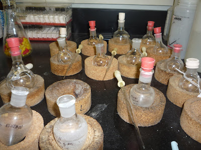 В настоящее время файл включает описание 31 колбы. И все они очень разные. Ни одной я не покупал в Stockroom’е, все достались мне от прежних хозяев или вообще были найдены безхозными. Я все равно продолжаю взвешивать колбы каждый раз. Это не только дает мне проверку флуктуации весов (обычно до 1 мг), но и собирает статистику о том, сколько и какую колбу я использовал. Вообще, по моей тетради можно восстановить и то, какие фракции какого эксперимента в какой колбе упаривались. Дальнейшее развитие такой шизофрении должно привести к тому, что я присвою колбам имена собственные и буду справлять их именины.