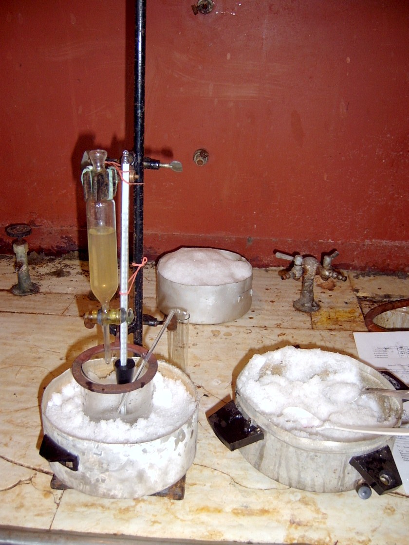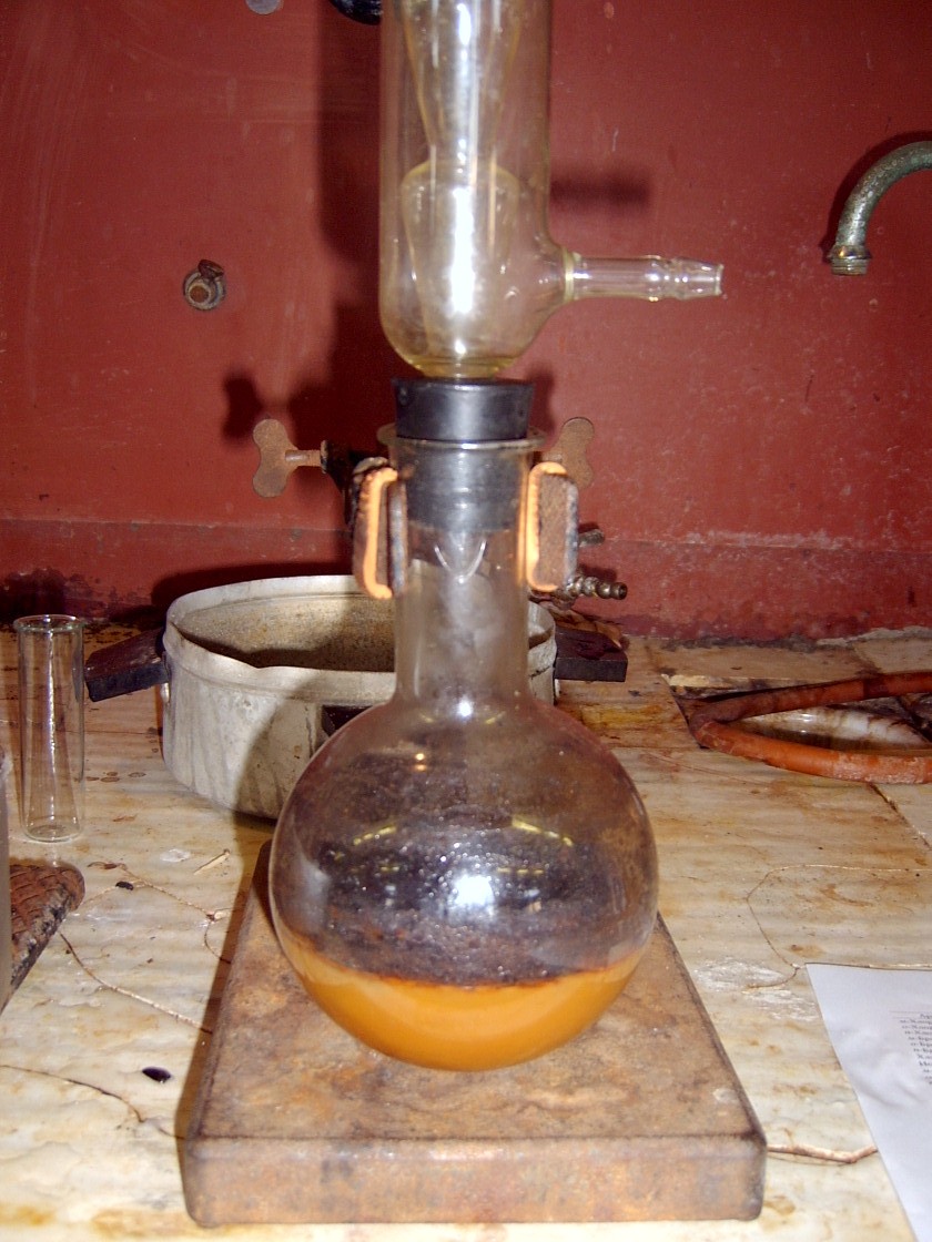 Охлаждение реакционной смеси в условиях российской лаборатории процесс суетливый. Там нет ни машины по производству льда обыкновенного в коридоре, ни запасов льда сухого. Наиболее распространенный источник льда – это обрезанные пластиковые бутылки в морозилке. Достаешь такую бутылку, заворачиваешь в старый халат и осторожно обстукиваешь широкой плоскостью молотка (если он есть, а то придется лапкой для штатива орудовать). Тут самое искусство, недоступное новичкам, выбить лед из бутылки и не пробить при этом в бутылке дыр. Ну, а потом надо не забыть заполнить бутылку новой водой и вернуть ее в морозилку. А та не резиновая, так что лед рискует оказаться дефицитом. К счастью, диазоний я делал одним из первых и хорошо помню, как мы с Машей Пешковой выходили на улицу и искали возле химфаковского крыльца снег почище. Было начало марта. Кто не успел, тот колол лед из холодильника. Сам синтез прошел у меня тихо и гладко. А вот в соседней лабе после добавления иодида калия азот начал выделяться настолько бурно, что разорвал колбу в клочья-осколки.