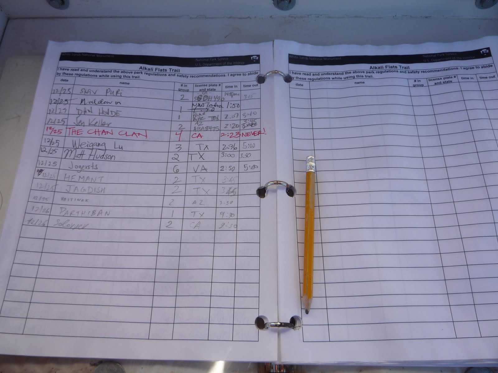 Видели мы там и записи с только начальным временем: то ли забыли отметиться, то ли на самом деле потерялись. Так что затея с этим журналом сомнительна. Ворота парка открыты с 7 утра до 5 вечера, потому проще пересчитать оставшиеся после заката машины. После наступления темноты можно оставаться только, получив у рейнджеров разрешение.