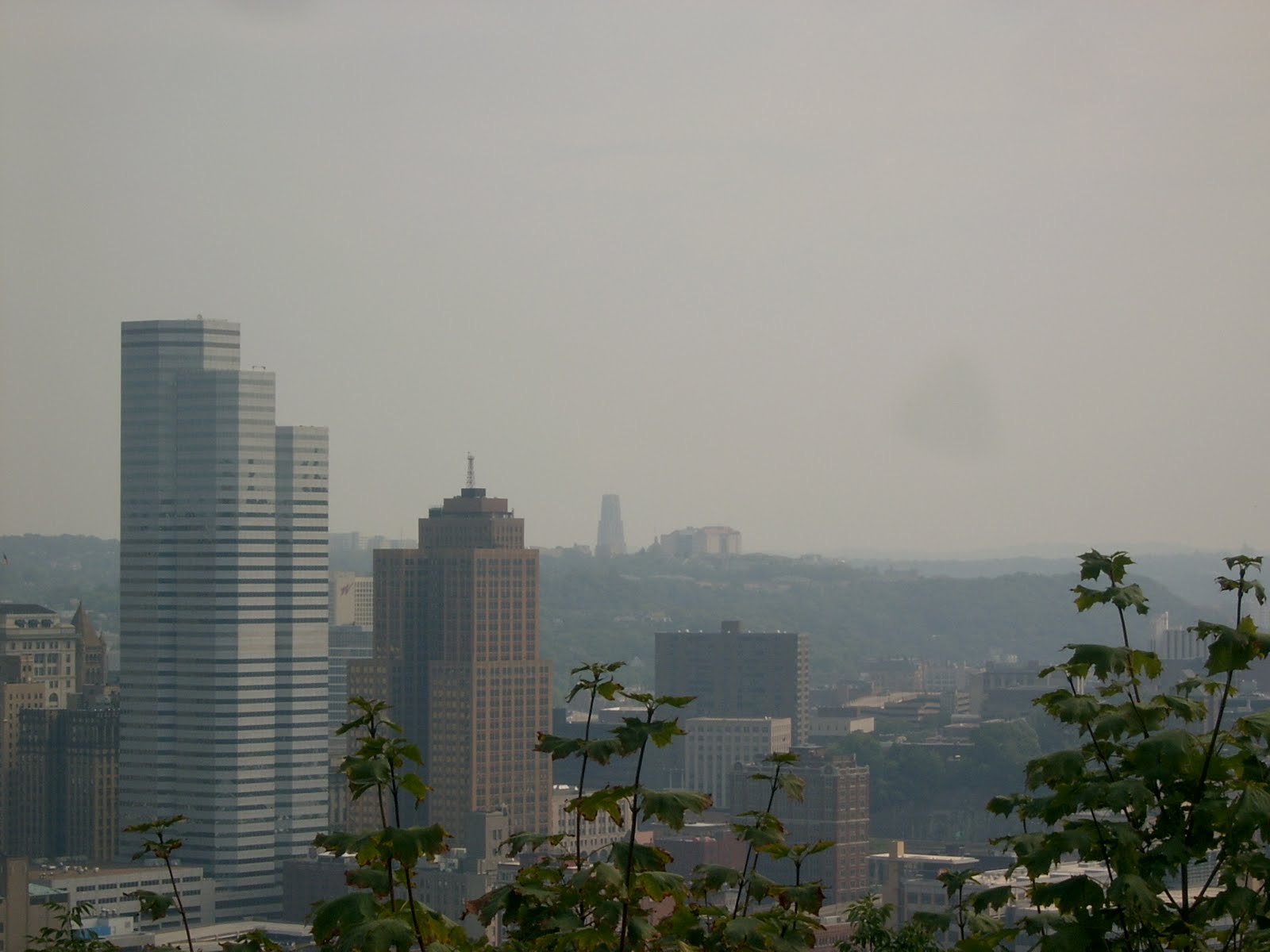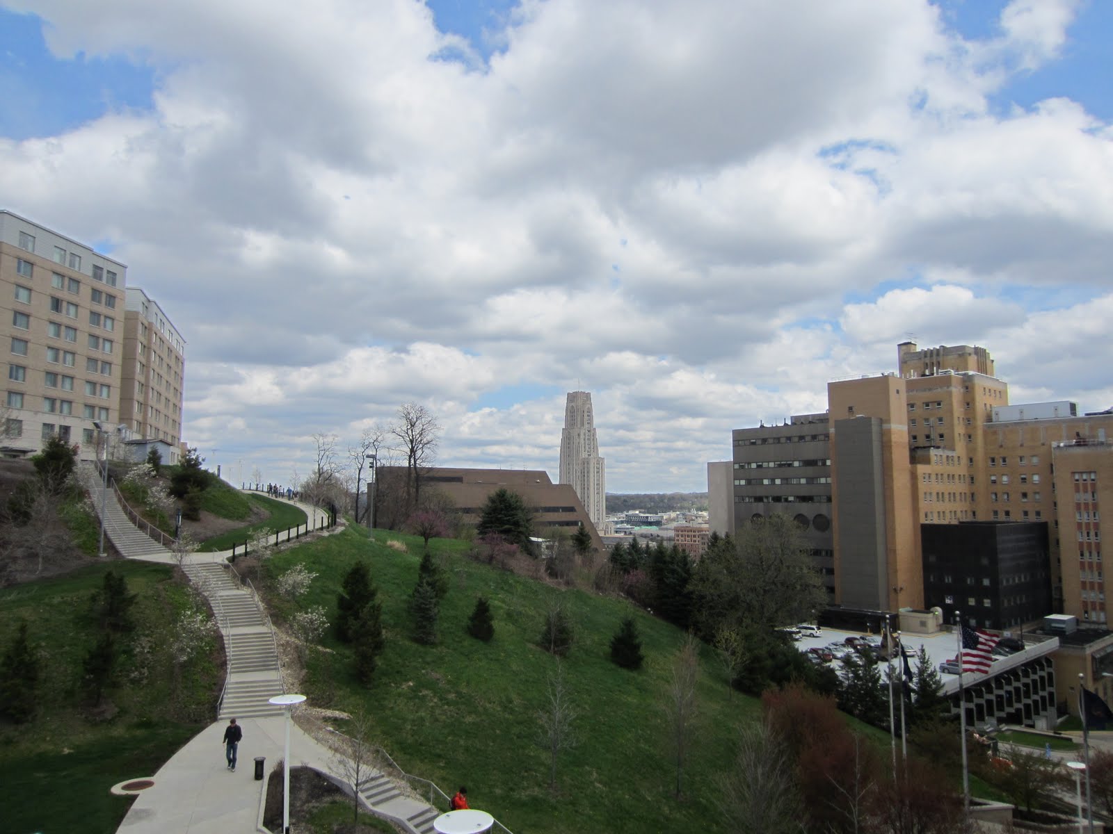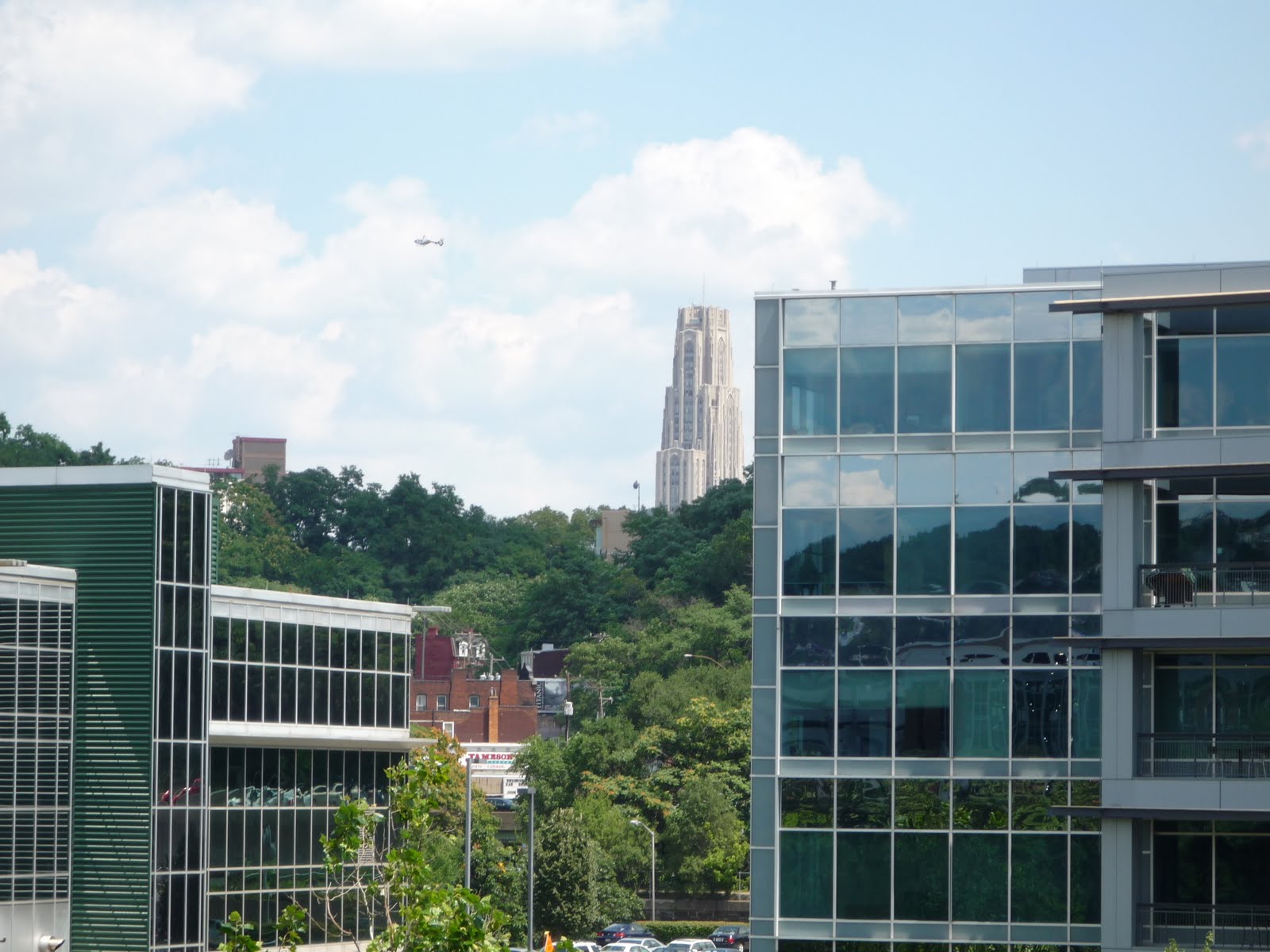 Этажи выше 36-ого закрыты для простых смертных. Они по большей части технические, но там же расположена комната для специальных приемов и заседаний, из которой открывается круговая панорама на славный город Питтсбург. Мы же ограничились немытым окном 35-го этажа, из которого можно увидеть небоскребы Даунтауна, поднимающиеся на холм жилые кварталы и постройки кампуса, в том числе здание химфака – Chevron Science Center (четырнадцатиэтажная башня по центру с пристроенной слева фиолетовой коробкой).