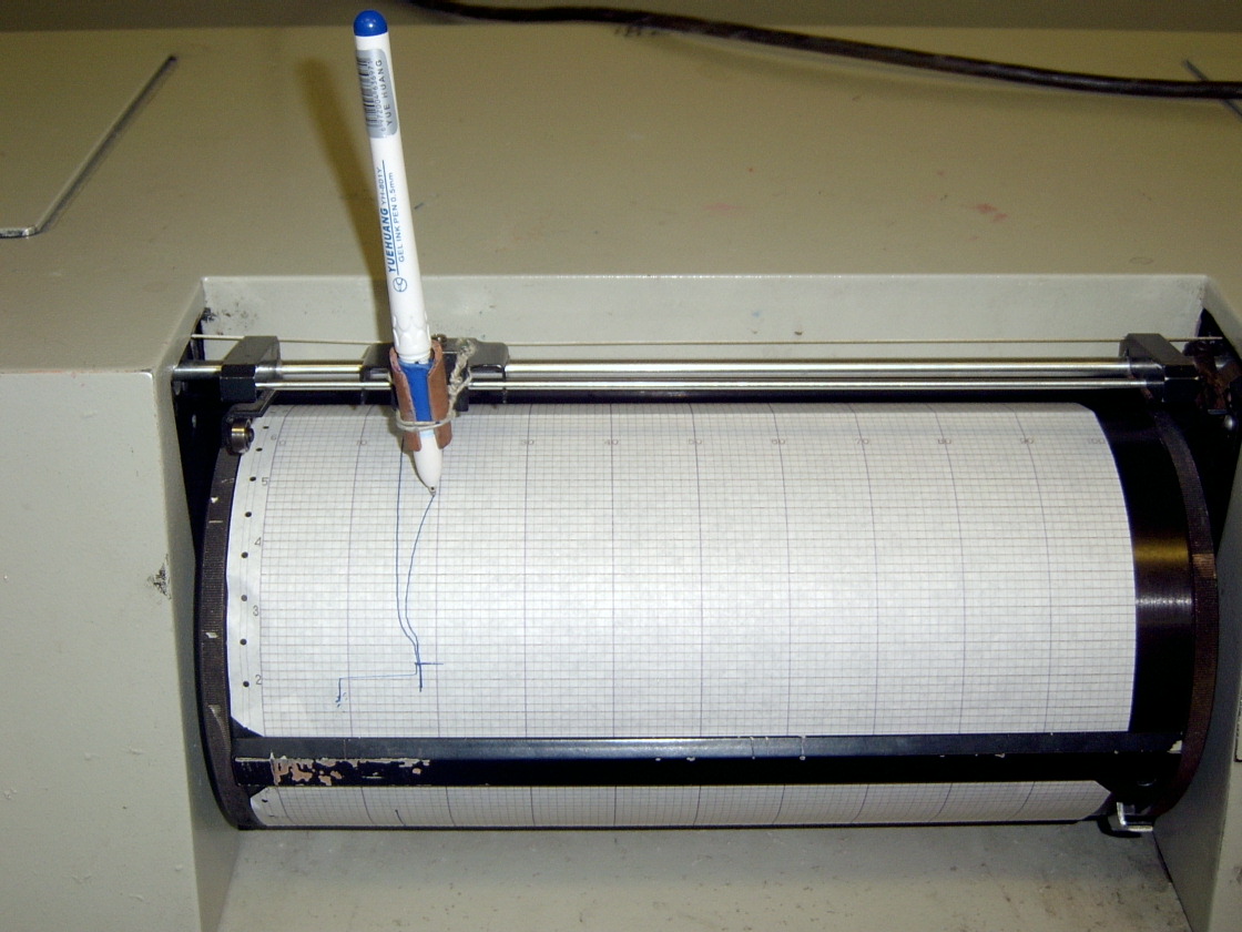 Какие-то колебательные частоты я помнил еще с олимпиадных времен. Потом у всех кафедр органического куста был предмет физметоды, где ИК было посвещено несколько лекций. Курс читал Михаил Анатольевич Кузнецов, который у меня же вел оргпрактикум, потом писал мне рекомендательные письма в аспирантуру, а ныне является завкафом органической химии в СПбГУ. Несмотря на неплохую теоретическую подготовку, сами ИК спектры за время моего студенчества я так и не снимал. Если не считать, конечно, довольно странного практикума на том же четвертом курсе под названием «Молекулярная спектроскопия». Там стоял инструмент чуть ли не сороковых годов, который методично, в течение нескольких минут вырисовывал на бумаге спектр (уж не помню, что там было за соединение). Побродив по папкам с фотографиями, датированными осенью 2005-го, я смог найти не только изображение этого монстра,