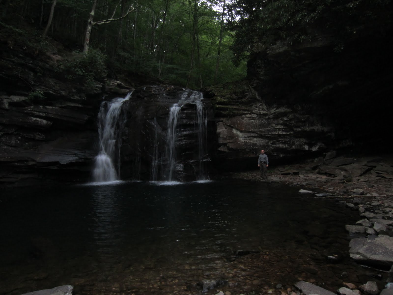 В 6.15 небо уже просветлело, и можно было разглядеть, куда ставить ногу. Мы перебрались через ручей и очень скоро дошли до развилки троп. Но обязательно следовало пройти еще немного по старой тропе, чтобы увидеть самый большой из Seneca Falls. По фотографии видно, что еще не рассеялись утренние сумерки.