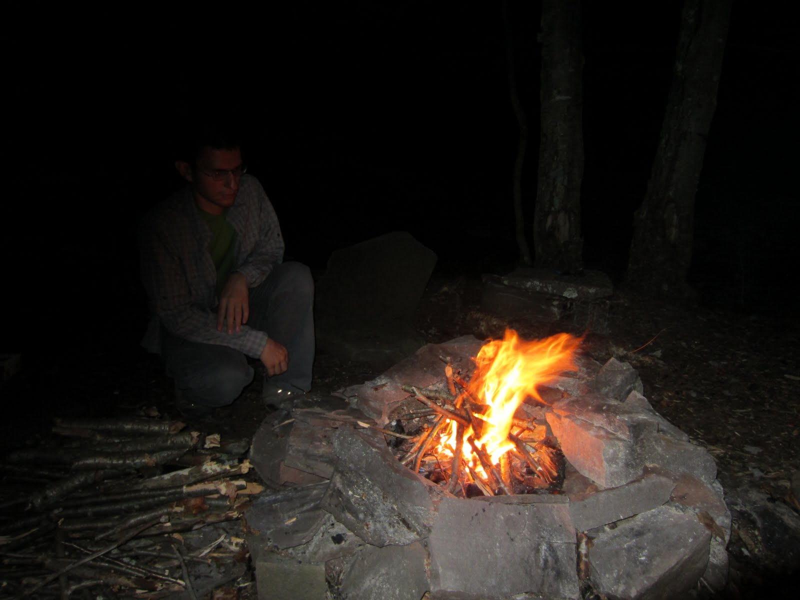 Через час пути нам стали попадаться расставленные по берегам ручья палатки. Место действительно популярно для ночевки в лесу. Мы приехали позже всех и дальше всех забрались в чащу. Но и нам отыскалось подходящее ровное место с обложенным камнями кострищем. Было около 7.40 вечера. Пока окончательно не стемнело мы притащили дров (сухие деревья основательно подчищены в приличном радиусе от стоянки), поставили палатку и разожгли костер.