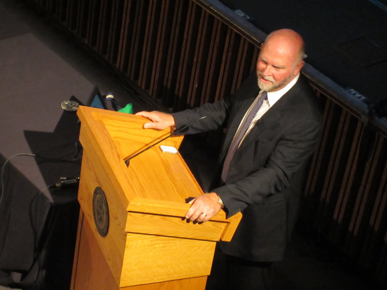 Начал он издалека, с руководящей цитаты президента Обамы, высказанной накануне по случаю кончины Стива Джобса, что вот на таких людях держится Америка, и подвел к тому, что Крейг Вентер – один из таких людей. И пока он с нами, надо его любить и славить, а потому Университет Питтсбурга вручает ему почетный приз Диксона. Далее декан медицинской школы рассказал уже о научной составляющей Крейга Вертера. О том, как будучи директором одного из институтов в NIH, он, то есть декан, сделал Вентеру самый большой подарок в жизни – не дал денег на слишком амбициозный проект. В результате Вентер обиделся, основал собственную компанию и назло NIH закончил секвенирование генома раньше всех. А потом декан и канцлер вручили Вентеру медальку того самого некоего Диксона и предоставили лауреату слово.
