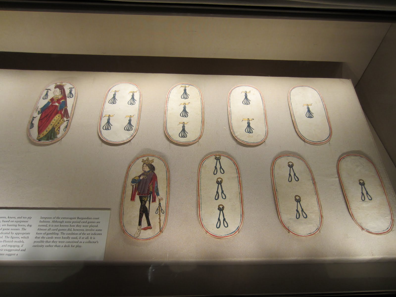 На нижнем этаже у них была подобная выставка ювелирных изделий, так мы ее быстро пробежали. Как исключение, меня заинтересовали игральные карты. Пояснительная табличка утверждает, что это единственная известная колода (не таро) 15-го века. Можно попытаться угадать прототипы современных мастей.