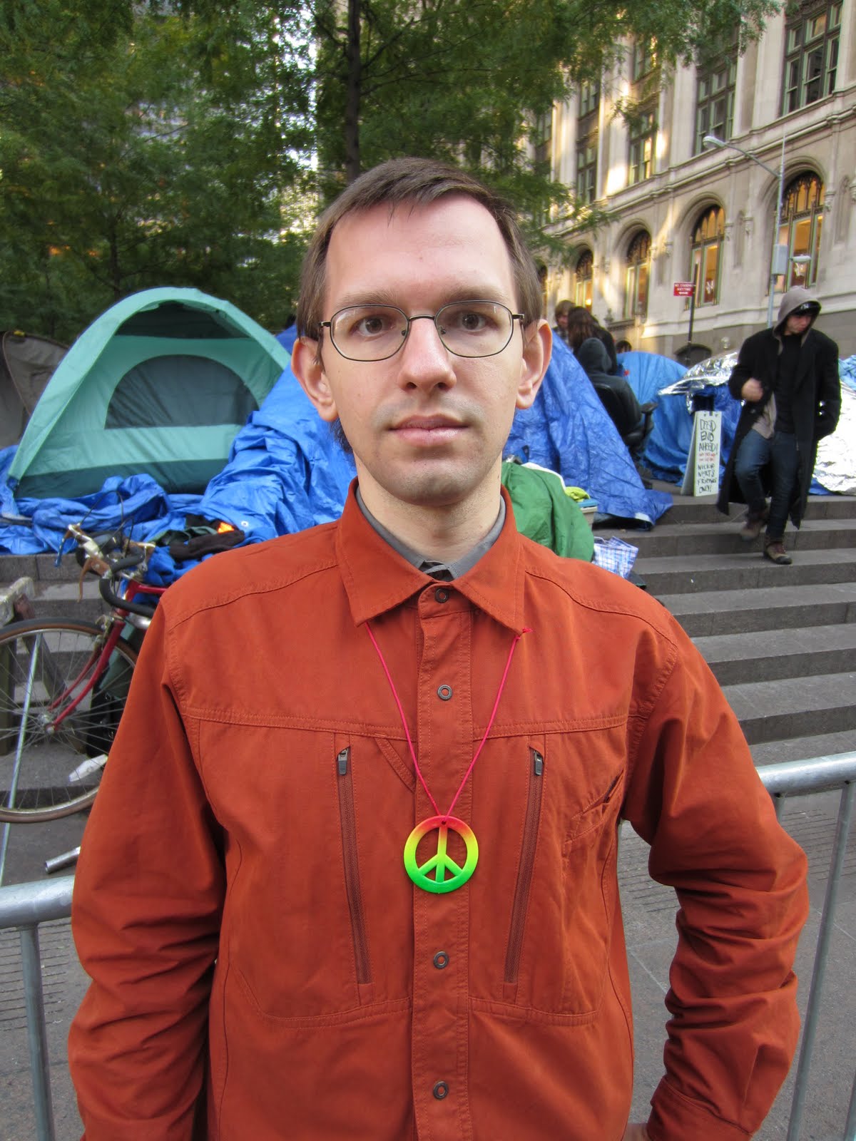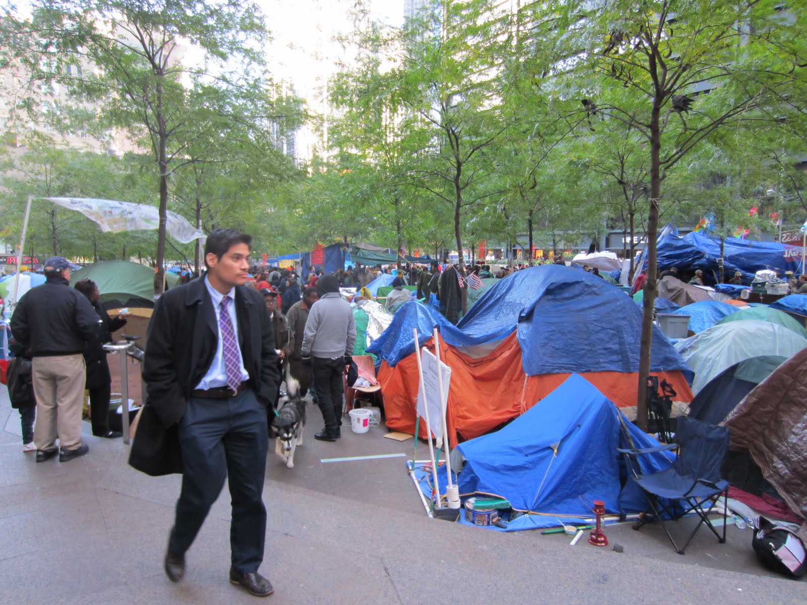 А вот уж вдалеке замаячили радужные знамена и синие палатки. В Zuccotti парке, плотными рядами уже полтора месяца стоит лагерь оккупатов Уолл-стрита.