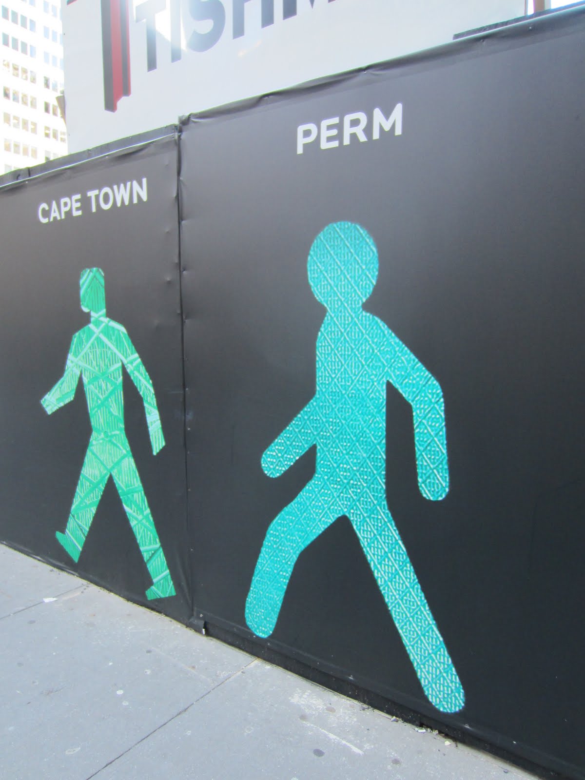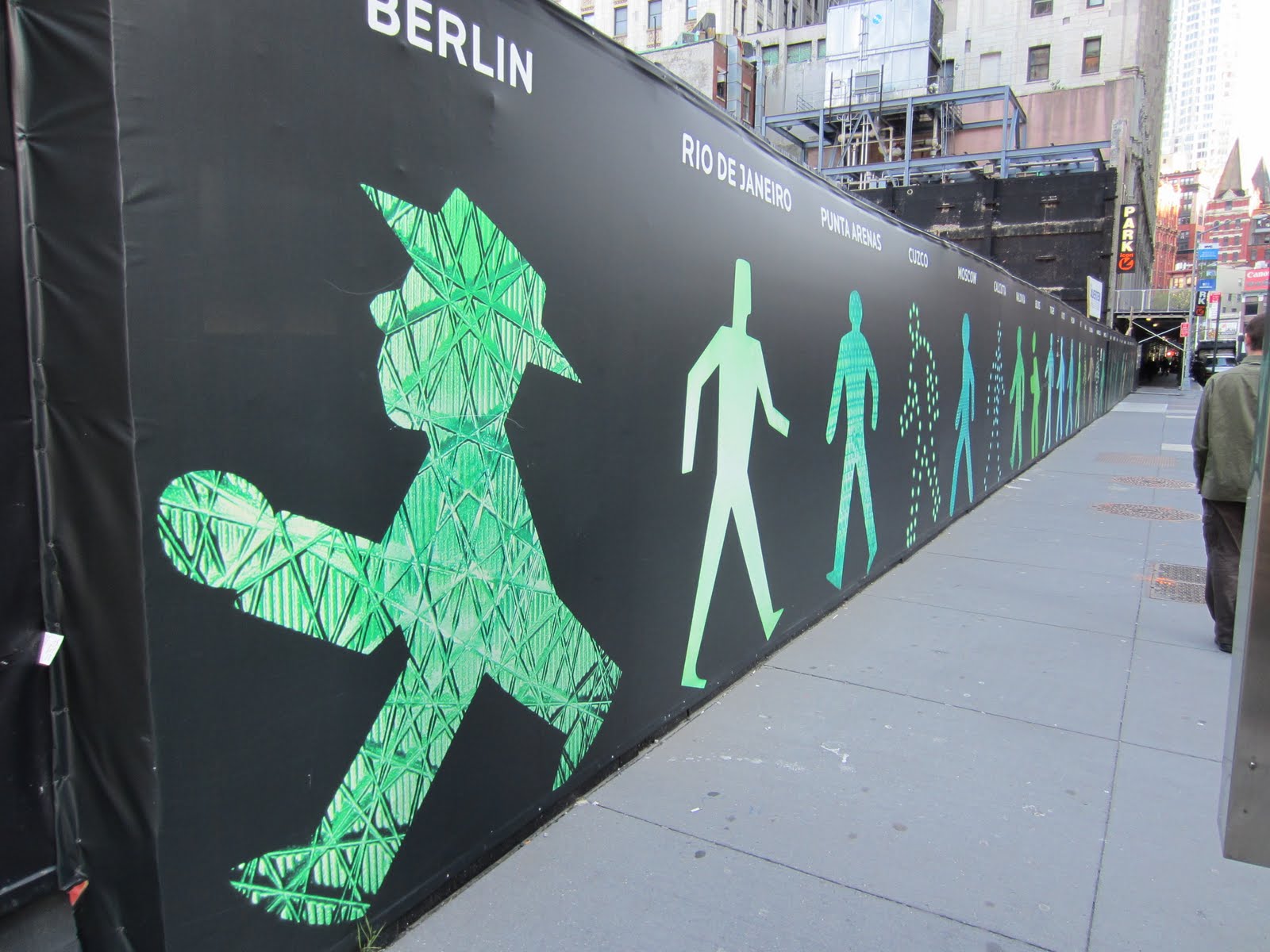 Достаточно было идти на юг по Бродвею. По пути попался строительный забор с пешеходами из разных городов.